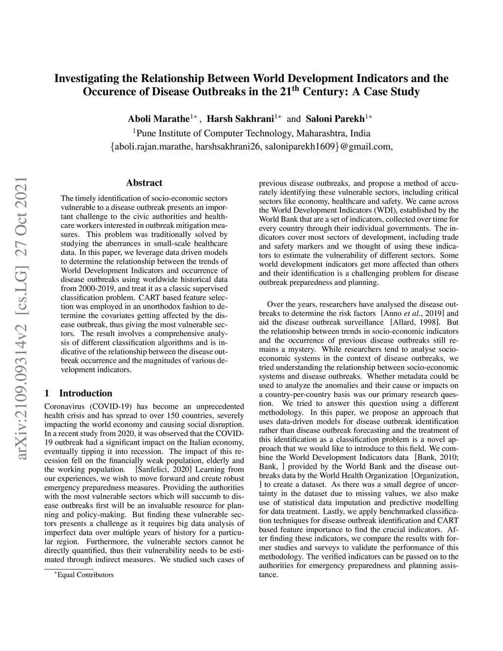 The timely identification of socio-economic sectors vulnerable to a disease outbreak presents an important challenge to the civic authorities and healthcare workers interested in outbreak mitigation measures. This problem was traditionally solved by studying the aberrances in small-scale healthcare data. In this paper, we leverage data driven models to determine the relationship between the trends of World Development Indicators and occurrence of disease outbreaks using worldwide historical data from 2000-2019, and treat it as a classic supervised classification problem. CART based feature selection was employed in an unorthodox fashion to determine the covariates getting affected by the disease outbreak, thus giving the most vulnerable sectors. The result involves a comprehensive analysis of different classification algorithms and is indicative of the relationship between the disease outbreak occurrence and the magnitudes of various development indicators.