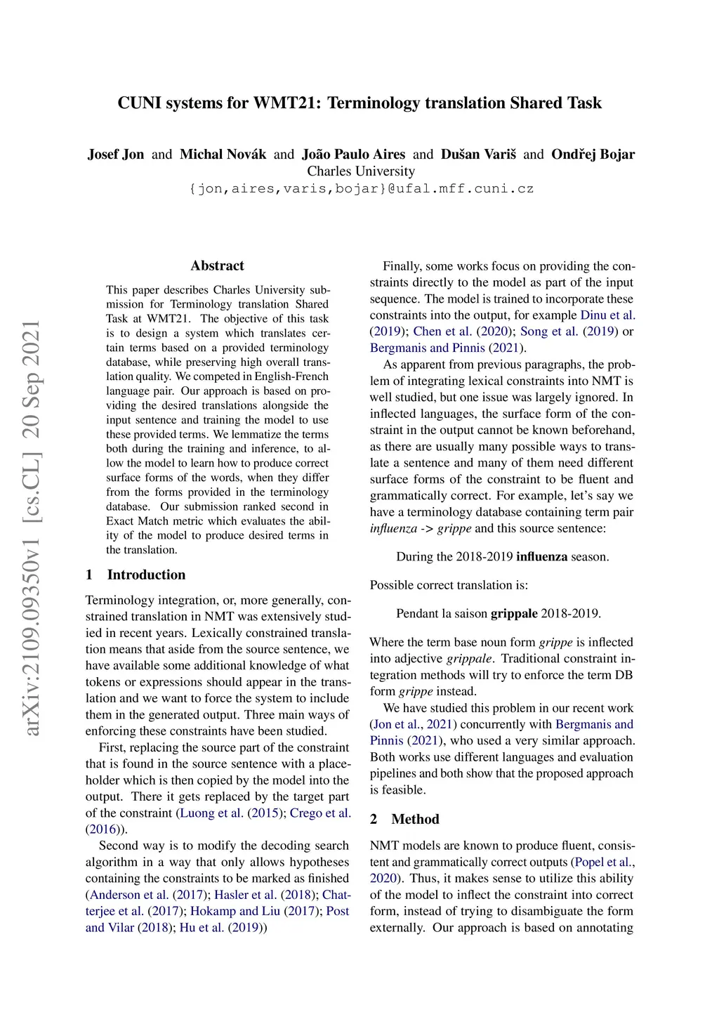 This paper describes Charles University submission for Terminology translation Shared Task at WMT21. The objective of this task is to design a system which translates certain terms based on a provided terminology database, while preserving high overall translation quality. We competed in English-French language pair. Our approach is based on providing the desired translations alongside the input sentence and training the model to use these provided terms. We lemmatize the terms both during the training and inference, to allow the model to learn how to produce correct surface forms of the words, when they differ from the forms provided in the terminology database. Our submission ranked second in Exact Match metric which evaluates the ability of the model to produce desired terms in the translation.