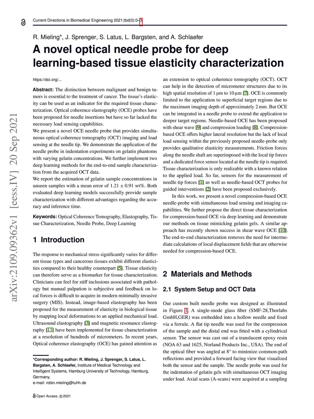 The distinction between malignant and benign tumors is essential to the treatment of cancer. The tissue's elasticity can be used as an indicator for the required tissue characterization. Optical coherence elastography (OCE) probes have been proposed for needle insertions but have so far lacked the necessary load sensing capabilities. We present a novel OCE needle probe that provides simultaneous optical coherence tomography (OCT) imaging and load sensing at the needle tip. We demonstrate the application of the needle probe in indentation experiments on gelatin phantoms with varying gelatin concentrations. We further implement two deep learning methods for the end-to-end sample characterization from the acquired OCT data. We report the estimation of gelatin sample concentrations in unseen samples with a mean error of wt\%. Both evaluated deep learning models successfully provide sample characterization with different advantages regarding the accuracy and inference time.