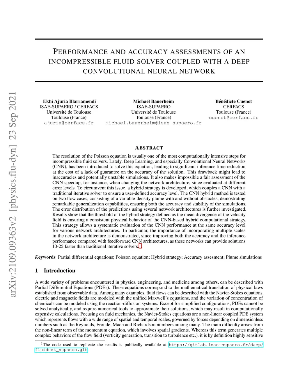 The resolution of the Poisson equation is usually one of the most computationally intensive steps for incompressible fluid solvers. Lately, Deep Learning, and especially Convolutional Neural Networks (CNN), has been introduced to solve this equation, leading to significant inference time reduction at the cost of a lack of guarantee on the accuracy of the solution. This drawback might lead to inaccuracies and potentially unstable simulations. It also makes impossible a fair assessment of the CNN speedup, for instance, when changing the network architecture, since evaluated at different error levels. To circumvent this issue, a hybrid strategy is developed, which couples a CNN with a traditional iterative solver to ensure a user-defined accuracy level. The CNN hybrid method is tested on two flow cases, consisting of a variable-density plume with and without obstacles, demostrating remarkable generalization capabilities, ensuring both the accuracy and stability of the simulations. The error distribution of the predictions using several network architectures is further investigated. Results show that the threshold of the hybrid strategy defined as the mean divergence of the velocity field is ensuring a consistent physical behavior of the CNN-based hybrid computational strategy. This strategy allows a systematic evaluation of the CNN performance at the same accuracy level for various network architectures. In particular, the importance of incorporating multiple scales in the network architecture is demonstrated, since improving both the accuracy and the inference performance compared with feedforward CNN architectures, as these networks can provide solutions 1 10-25 faster than traditional iterative solvers.