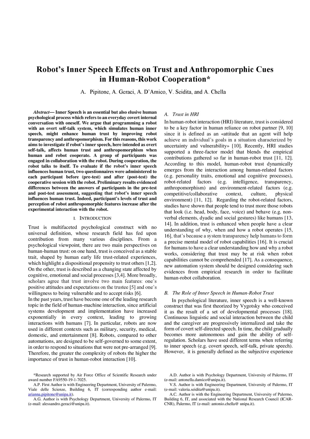 Robot's Inner Speech Effects on Trust and Anthropomorphic Cues in