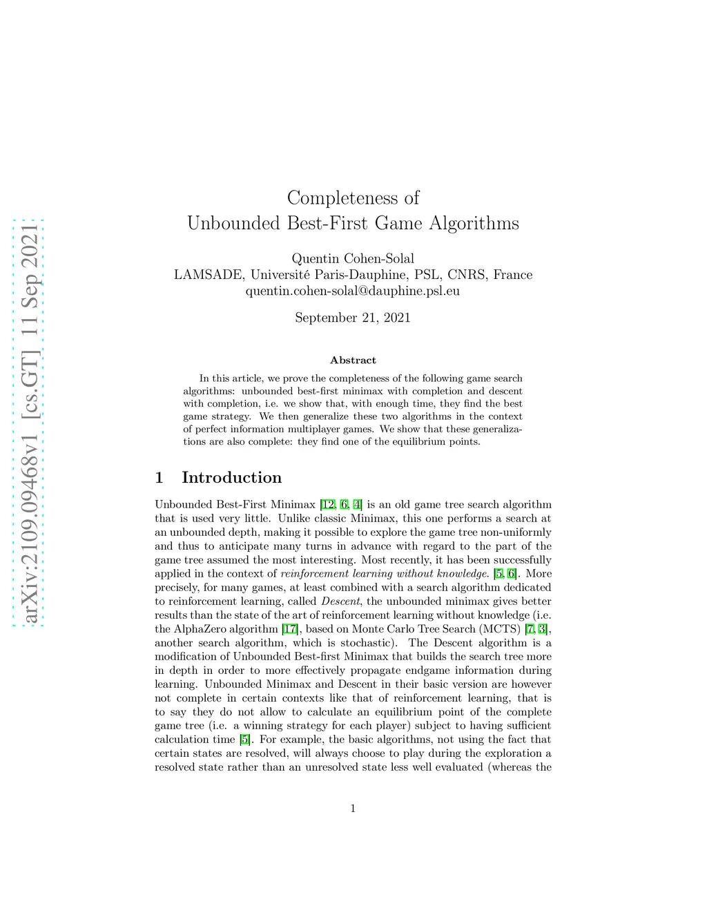 In this article, we prove the completeness of the following game search algorithms: unbounded best-first minimax with completion and descent with completion, i.e. we show that, with enough time, they find the best game strategy. We then generalize these two algorithms in the context of perfect information multiplayer games. We show that these generalizations are also complete: they find one of the equilibrium points.