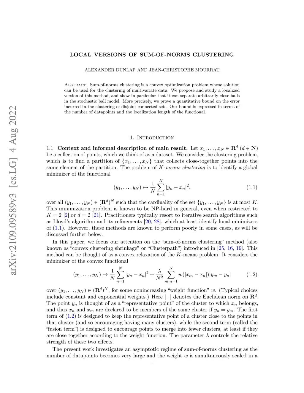 Sum-of-norms clustering is a convex optimization problem whose solution can be used for the clustering of multivariate data. We propose and study a localized version of this method, and show in particular that it can separate arbitrarily close balls in the stochastic ball model. More precisely, we prove a quantitative bound on the error incurred in the clustering of disjoint connected sets. Our bound is expressed in terms of the number of datapoints and the localization length of the functional.