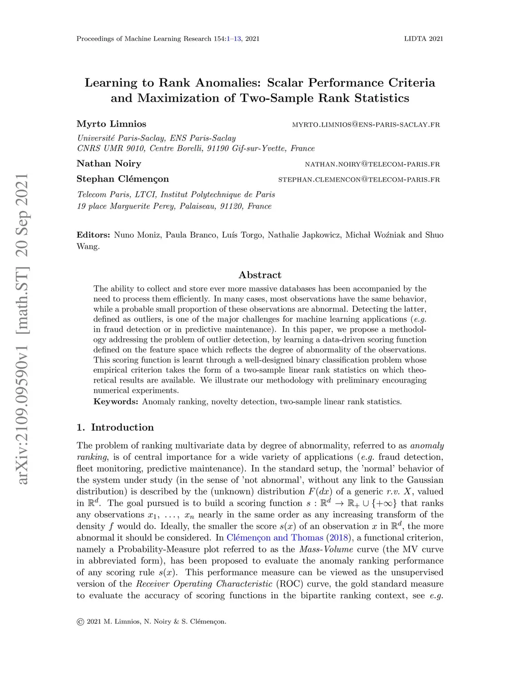 The ability to collect and store ever more massive databases has been accompanied by the need to process them efficiently. In many cases, most observations have the same behavior, while a probable small proportion of these observations are abnormal. Detecting the latter, defined as outliers, is one of the major challenges for machine learning applications (e.g. in fraud detection or in predictive maintenance). In this paper, we propose a methodology addressing the problem of outlier detection, by learning a data-driven scoring function defined on the feature space which reflects the degree of abnormality of the observations. This scoring function is learnt through a well-designed binary classification problem whose empirical criterion takes the form of a two-sample linear rank statistics on which theoretical results are available. We illustrate our methodology with preliminary encouraging numerical experiments.