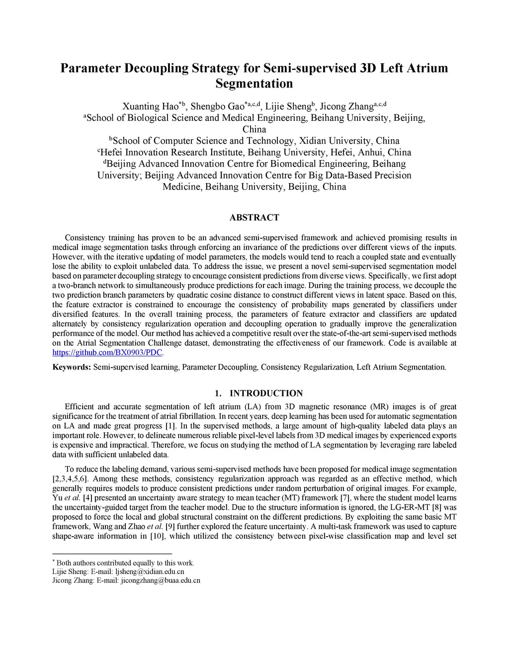 Parameter Decoupling Strategy for Semi-supervised 3D Left Atrium