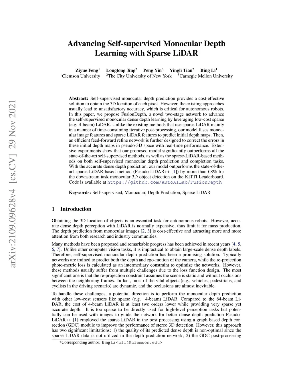 Advancing Self-supervised Monocular Depth Learning with Sparse LiDAR