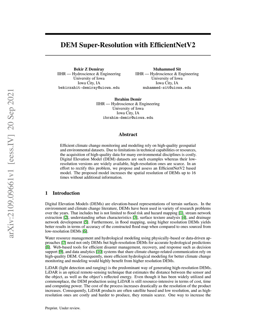 Efficient climate change monitoring and modeling rely on high-quality geospatial and environmental datasets. Due to limitations in technical capabilities or resources, the acquisition of high-quality data for many environmental disciplines is costly. Digital Elevation Model (DEM) datasets are such examples whereas their low-resolution versions are widely available, high-resolution ones are scarce. In an effort to rectify this problem, we propose and assess an EfficientNetV2 based model. The proposed model increases the spatial resolution of DEMs up to 16times without additional information.