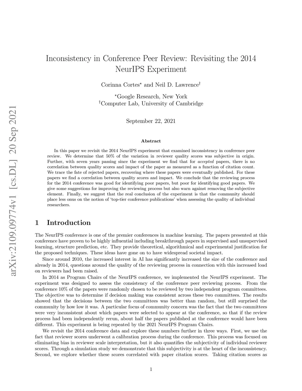 In this paper we revisit the 2014 NeurIPS experiment that examined inconsistency in conference peer review. We determine that 50\% of the variation in reviewer quality scores was subjective in origin. Further, with seven years passing since the experiment we find that for \emph{accepted} papers, there is no correlation between quality scores and impact of the paper as measured as a function of citation count. We trace the fate of rejected papers, recovering where these papers were eventually published. For these papers we find a correlation between quality scores and impact. We conclude that the reviewing process for the 2014 conference was good for identifying poor papers, but poor for identifying good papers. We give some suggestions for improving the reviewing process but also warn against removing the subjective element. Finally, we suggest that the real conclusion of the experiment is that the community should place less onus on the notion of `top-tier conference publications' when assessing the quality of individual researchers. For NeurIPS 2021, the PCs are repeating the experiment, as well as conducting new ones.