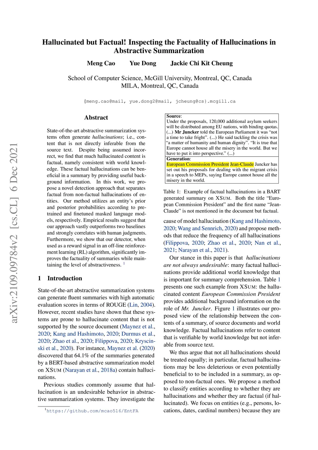State-of-the-art abstractive summarization systems often generate \emph{hallucinations}; i.e., content that is not directly inferable from the source text. Despite being assumed incorrect, we find that much hallucinated content is factual, namely consistent with world knowledge. These factual hallucinations can be beneficial in a summary by providing useful background information. In this work, we propose a novel detection approach that separates factual from non-factual hallucinations of entities. Our method utilizes an entity's prior and posterior probabilities according to pre-trained and finetuned masked language models, respectively. Empirical results suggest that our approach vastly outperforms two baselines %in both accuracy and F1 scores and strongly correlates with human judgments. % on factuality classification tasks. Furthermore, we show that our detector, when used as a reward signal in an off-line reinforcement learning (RL) algorithm, significantly improves the factuality of summaries while maintaining the level of abstractiveness.