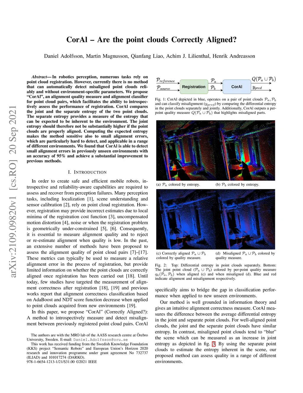 In robotics perception, numerous tasks rely on point cloud registration. However, currently there is no method that can automatically detect misaligned point clouds reliably and without environment-specific parameters. We propose "CorAl", an alignment quality measure and alignment classifier for point cloud pairs, which facilitates the ability to introspectively assess the performance of registration. CorAl compares the joint and the separate entropy of the two point clouds. The separate entropy provides a measure of the entropy that can be expected to be inherent to the environment. The joint entropy should therefore not be substantially higher if the point clouds are properly aligned. Computing the expected entropy makes the method sensitive also to small alignment errors, which are particularly hard to detect, and applicable in a range of different environments. We found that CorAl is able to detect small alignment errors in previously unseen environments with an accuracy of 95% and achieve a substantial improvement to previous methods.