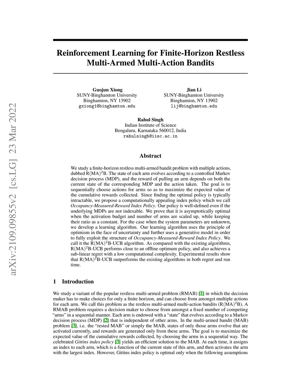 We study a finite-horizon restless multi-armed bandit problem with multiple actions, dubbed R(MA)^2B. The state of each arm evolves according to a controlled Markov decision process (MDP), and the reward of pulling an arm depends on both the current state of the corresponding MDP and the action taken. The goal is to sequentially choose actions for arms so as to maximize the expected value of the cumulative rewards collected. Since finding the optimal policy is typically intractable, we propose a computationally appealing index policy which we call Occupancy-Measured-Reward Index Policy. Our policy is well-defined even if the underlying MDPs are not indexable. We prove that it is asymptotically optimal when the activation budget and number of arms are scaled up, while keeping their ratio as a constant. For the case when the system parameters are unknown, we develop a learning algorithm. Our learning algorithm uses the principle of optimism in the face of uncertainty and further uses a generative model in order to fully exploit the structure of Occupancy-Measured-Reward Index Policy. We call it the R(MA)^2B-UCB algorithm. As compared with the existing algorithms, R(MA)^2B-UCB performs close to an offline optimum policy, and also achieves a sub-linear regret with a low computational complexity. Experimental results show that R(MA)^2B-UCB outperforms the existing algorithms in both regret and run time.
