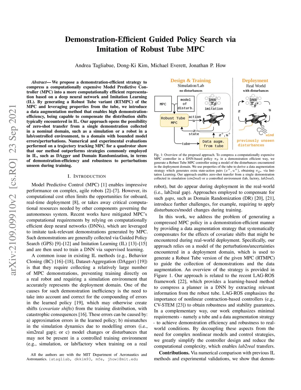 We propose a demonstration-efficient strategy to compress a computationally expensive Model Predictive Controller (MPC) into a more computationally efficient representation based on a deep neural network and Imitation Learning (IL). By generating a Robust Tube variant (RTMPC) of the MPC and leveraging properties from the tube, we introduce a data augmentation method that enables high demonstration-efficiency, being capable to compensate the distribution shifts typically encountered in IL. Our approach opens the possibility of zero-shot transfer from a single demonstration collected in a nominal domain, such as a simulation or a robot in a lab/controlled environment, to a domain with bounded model errors/perturbations. Numerical and experimental evaluations performed on a trajectory tracking MPC for a quadrotor show that our method outperforms strategies commonly employed in IL, such as DAgger and Domain Randomization, in terms of demonstration-efficiency and robustness to perturbations unseen during training.