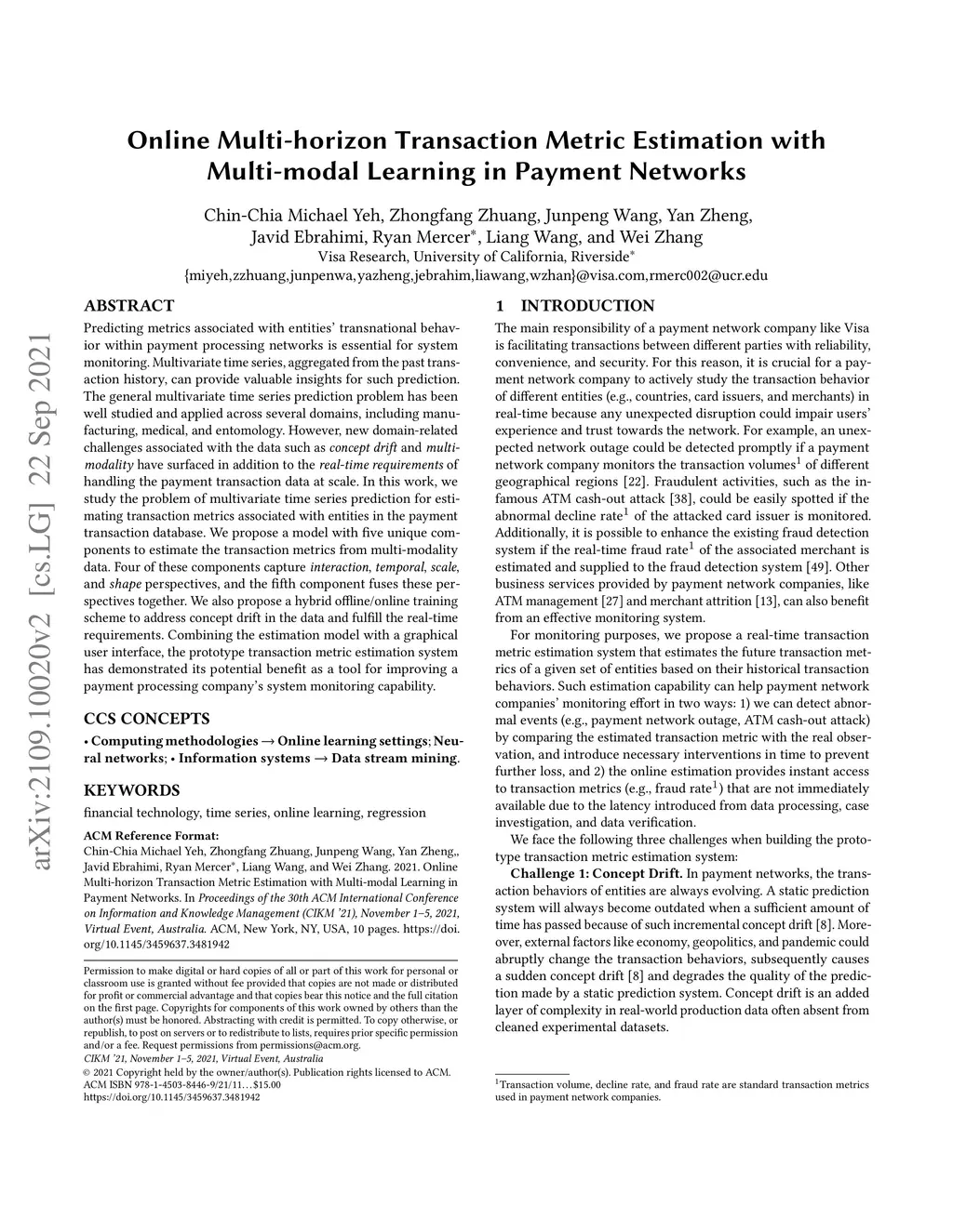 Predicting metrics associated with entities' transnational behavior within payment processing networks is essential for system monitoring. Multivariate time series, aggregated from the past transaction history, can provide valuable insights for such prediction. The general multivariate time series prediction problem has been well studied and applied across several domains, including manufacturing, medical, and entomology. However, new domain-related challenges associated with the data such as concept drift and multi-modality have surfaced in addition to the real-time requirements of handling the payment transaction data at scale. In this work, we study the problem of multivariate time series prediction for estimating transaction metrics associated with entities in the payment transaction database. We propose a model with five unique components to estimate the transaction metrics from multi-modality data. Four of these components capture interaction, temporal, scale, and shape perspectives, and the fifth component fuses these perspectives together. We also propose a hybrid offline/online training scheme to address concept drift in the data and fulfill the real-time requirements. Combining the estimation model with a graphical user interface, the prototype transaction metric estimation system has demonstrated its potential benefit as a tool for improving a payment processing company's system monitoring capability.
