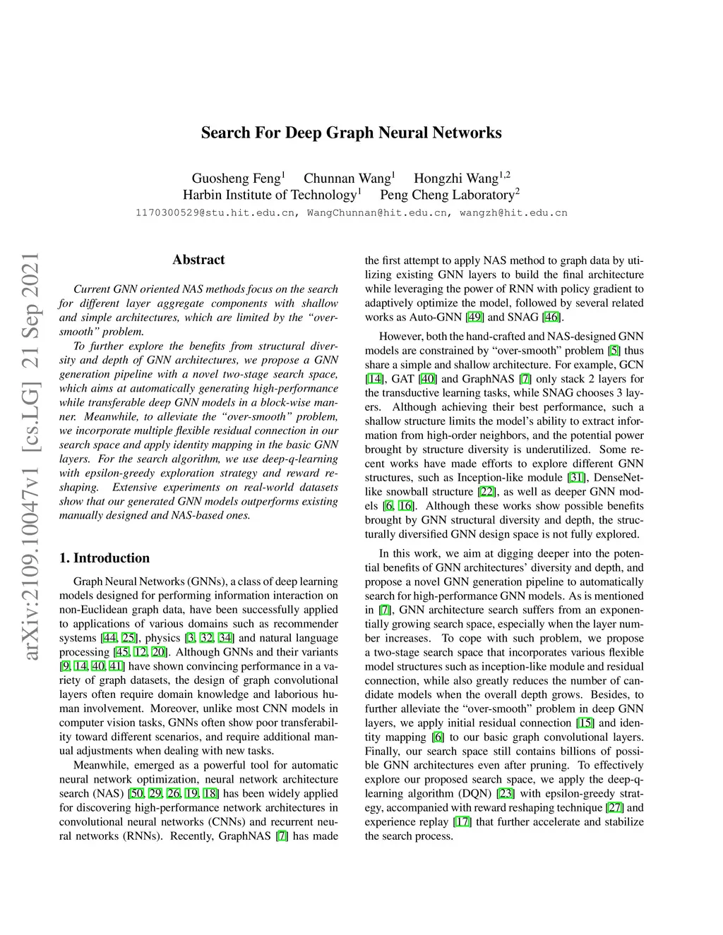 Current GNN-oriented NAS methods focus on the search for different layer aggregate components with shallow and simple architectures, which are limited by the óver-smooth' problem. To further explore the benefits from structural diversity and depth of GNN architectures, we propose a GNN generation pipeline with a novel two-stage search space, which aims at automatically generating high-performance while transferable deep GNN models in a block-wise manner. Meanwhile, to alleviate the óver-smooth' problem, we incorporate multiple flexible residual connection in our search space and apply identity mapping in the basic GNN layers. For the search algorithm, we use deep-q-learning with epsilon-greedy exploration strategy and reward reshaping. Extensive experiments on real-world datasets show that our generated GNN models outperforms existing manually designed and NAS-based ones.