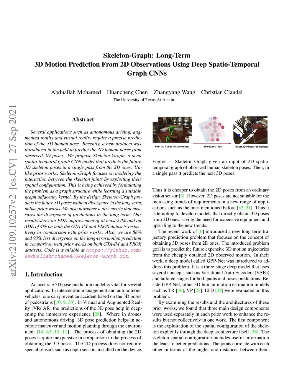 Several applications such as autonomous driving, augmented reality and virtual reality require a precise prediction of the 3D human pose. Recently, a new problem was introduced in the field to predict the 3D human poses from observed 2D poses. We propose Skeleton-Graph, a deep spatio-temporal graph CNN model that predicts the future 3D skeleton poses in a single pass from the 2D ones. Unlike prior works, Skeleton-Graph focuses on modeling the interaction between the skeleton joints by exploiting their spatial configuration. This is being achieved by formulating the problem as a graph structure while learning a suitable graph adjacency kernel. By the design, Skeleton-Graph predicts the future 3D poses without divergence in the long-term, unlike prior works. We also introduce a new metric that measures the divergence of predictions in the long term. Our results show an FDE improvement of at least 27% and an ADE of 4% on both the GTA-IM and PROX datasets respectively in comparison with prior works. Also, we are 88% and 93% less divergence on the long-term motion prediction in comparison with prior works on both GTA-IM and PROX datasets. Code is available at https://github.com/abduallahmohamed/Skeleton-Graph.git