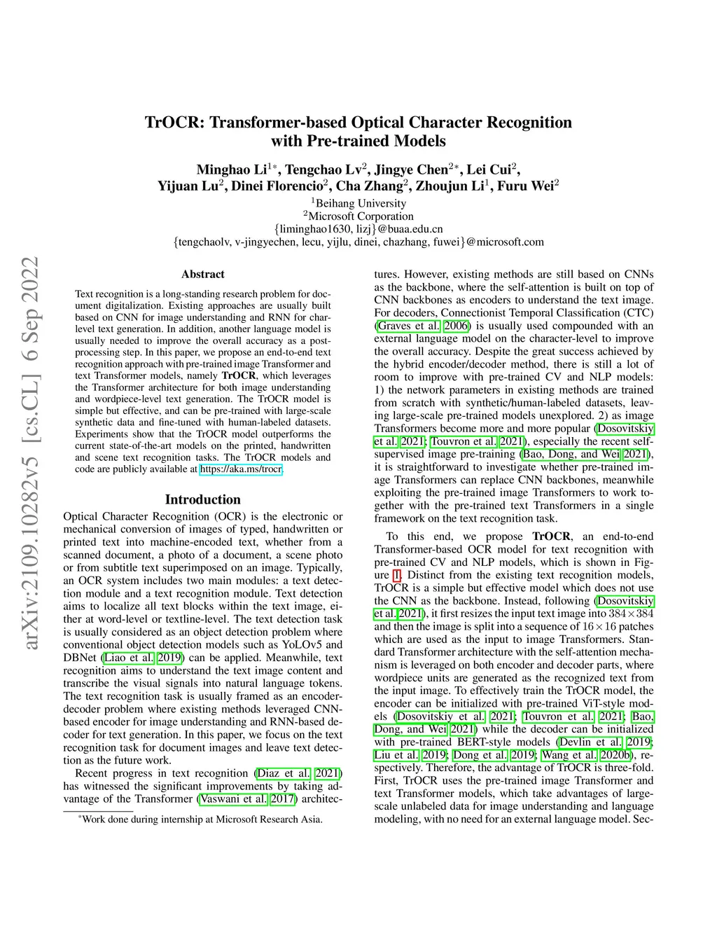 TrOCR: Transformer-based Optical Character Recognition with Pre-trained