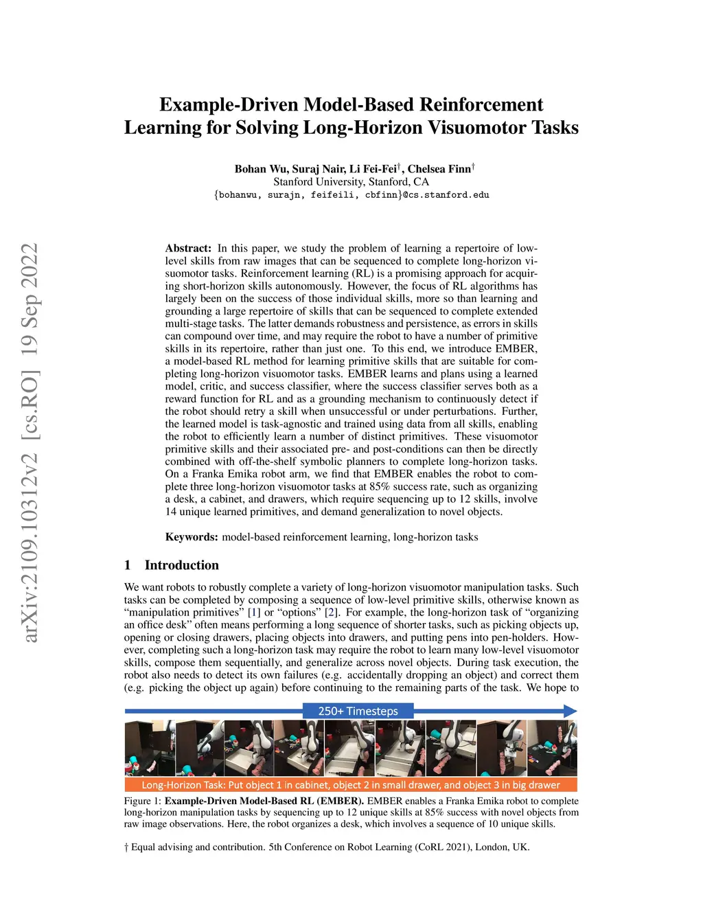 In this paper, we study the problem of learning a repertoire of low-level skills from raw images that can be sequenced to complete long-horizon visuomotor tasks. Reinforcement learning (RL) is a promising approach for acquiring short-horizon skills autonomously. However, the focus of RL algorithms has largely been on the success of those individual skills, more so than learning and grounding a large repertoire of skills that can be sequenced to complete extended multi-stage tasks. The latter demands robustness and persistence, as errors in skills can compound over time, and may require the robot to have a number of primitive skills in its repertoire, rather than just one. To this end, we introduce EMBER, a model-based RL method for learning primitive skills that are suitable for completing long-horizon visuomotor tasks. EMBER learns and plans using a learned model, critic, and success classifier, where the success classifier serves both as a reward function for RL and as a grounding mechanism to continuously detect if the robot should retry a skill when unsuccessful or under perturbations. Further, the learned model is task-agnostic and trained using data from all skills, enabling the robot to efficiently learn a number of distinct primitives. These visuomotor primitive skills and their associated pre- and post-conditions can then be directly combined with off-the-shelf symbolic planners to complete long-horizon tasks. On a Franka Emika robot arm, we find that EMBER enables the robot to complete three long-horizon visuomotor tasks at 85% success rate, such as organizing an office desk, a file cabinet, and drawers, which require sequencing up to 12 skills, involve 14 unique learned primitives, and demand generalization to novel objects.