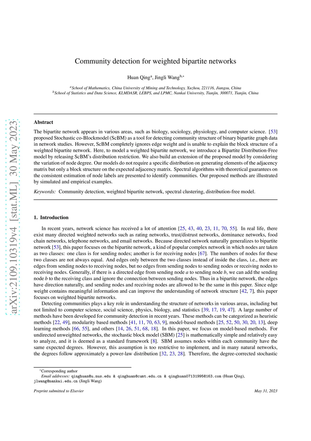 The bipartite network appears in various areas, such as biology, sociology, physiology, and computer science. \cite{rohe2016co} proposed Stochastic co-Blockmodel (ScBM) as a tool for detecting community structure of binary bipartite graph data in network studies. However, ScBM completely ignores edge weight and is unable to explain the block structure of a weighted bipartite network. Here, to model a weighted bipartite network, we introduce a Bipartite Distribution-Free model by releasing ScBM's distribution restriction. We also build an extension of the proposed model by considering the variation of node degree. Our models do not require a specific distribution on generating elements of the adjacency matrix but only a block structure on the expected adjacency matrix. Spectral algorithms with theoretical guarantees on the consistent estimation of node labels are presented to identify communities. Our proposed methods are illustrated by simulated and empirical examples.