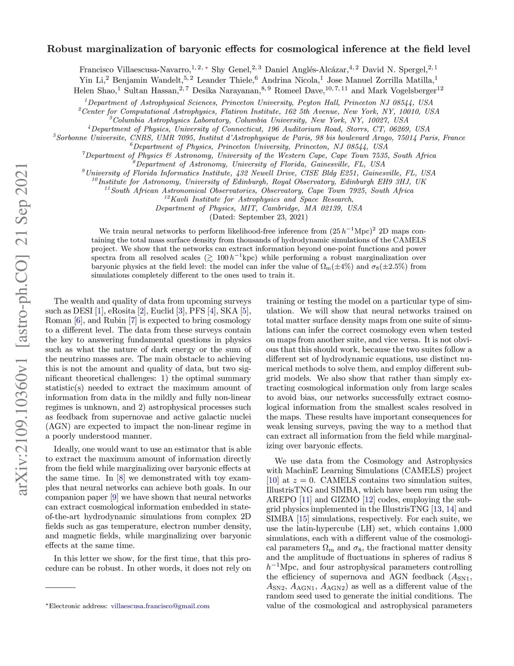 We train neural networks to perform likelihood-free inference from 2D maps containing the total mass surface density from thousands of hydrodynamic simulations of the CAMELS project. We show that the networks can extract information beyond one-point functions and power spectra from all resolved scales () while performing a robust marginalization over baryonic physics at the field level: the model can infer the value of and from simulations completely different to the ones used to train it.