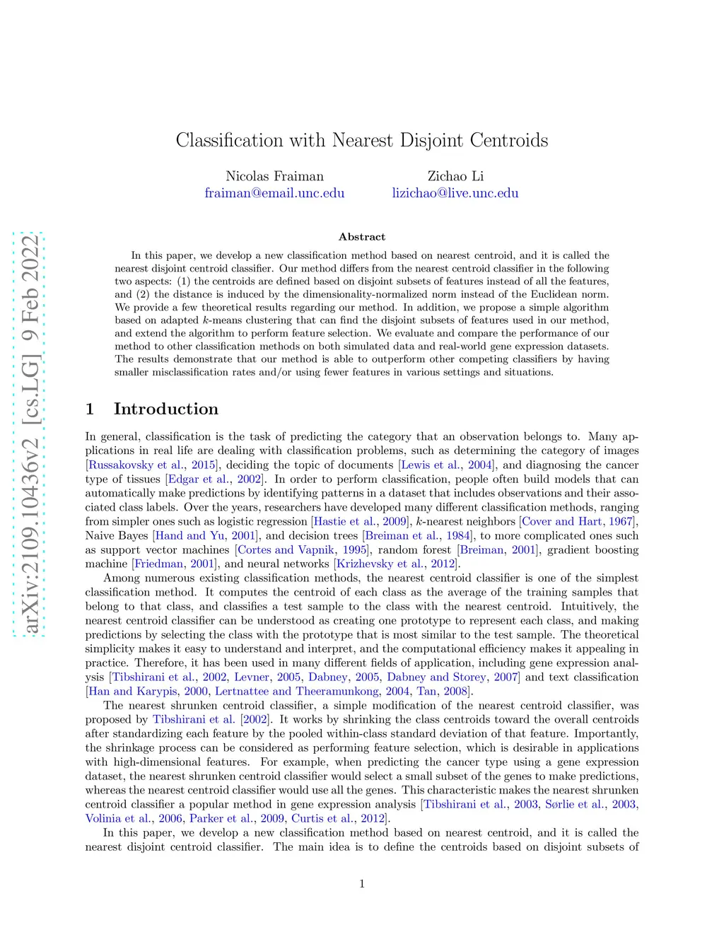 In this paper, we develop a new classification method based on nearest centroid, and it is called the nearest disjoint centroid classifier. Our method differs from the nearest centroid classifier in the following two aspects: (1) the centroids are defined based on disjoint subsets of features instead of all the features, and (2) the distance is induced by the dimensionality-normalized norm instead of the Euclidean norm. We provide a few theoretical results regarding our method. In addition, we propose a simple algorithm based on adapted k-means clustering that can find the disjoint subsets of features used in our method, and extend the algorithm to perform feature selection. We evaluate and compare the performance of our method to other classification methods on both simulated data and real-world gene expression datasets. The results demonstrate that our method is able to outperform other competing classifiers by having smaller misclassification rates and/or using fewer features in various settings and situations.