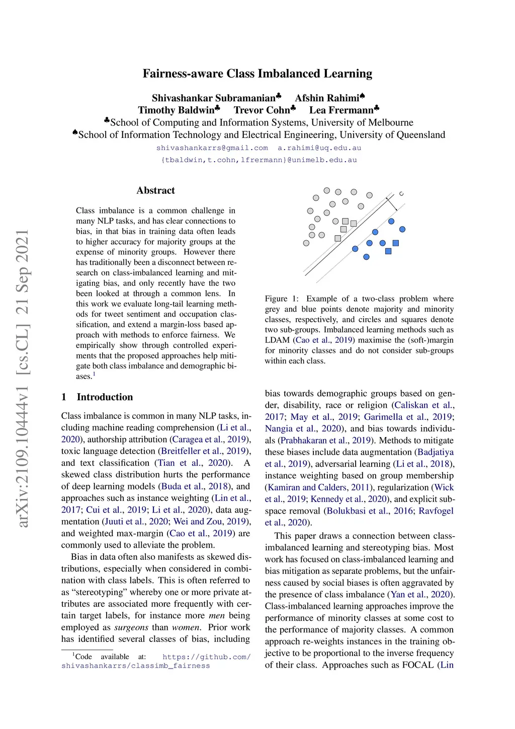 Class imbalance is a common challenge in many NLP tasks, and has clear connections to bias, in that bias in training data often leads to higher accuracy for majority groups at the expense of minority groups. However there has traditionally been a disconnect between research on class-imbalanced learning and mitigating bias, and only recently have the two been looked at through a common lens. In this work we evaluate long-tail learning methods for tweet sentiment and occupation classification, and extend a margin-loss based approach with methods to enforce fairness. We empirically show through controlled experiments that the proposed approaches help mitigate both class imbalance and demographic biases.