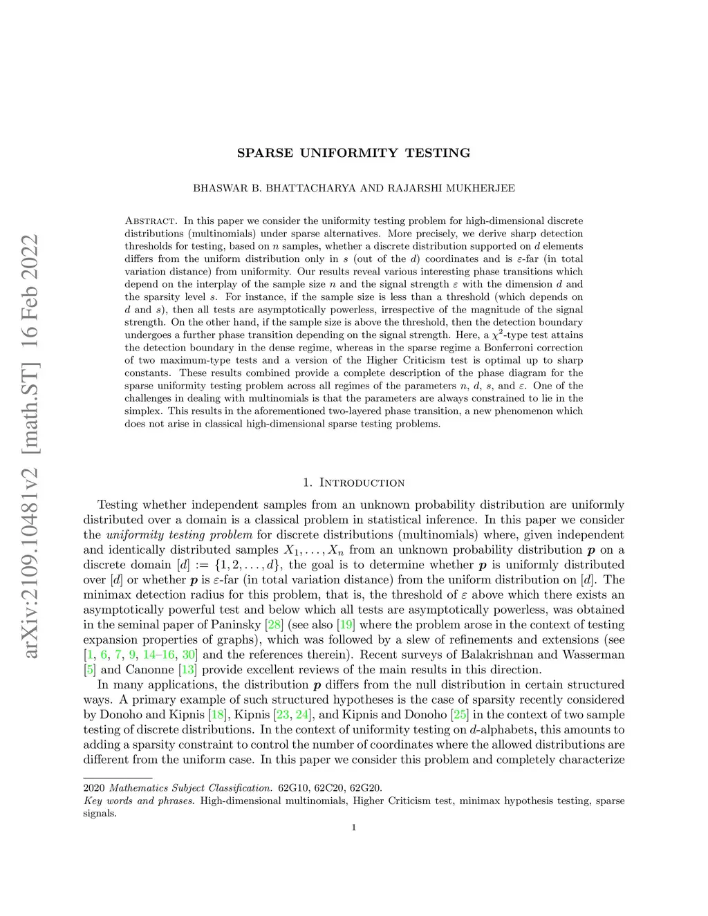 In this paper we consider the uniformity testing problem for high-dimensional discrete distributions (multinomials) under sparse alternatives. More precisely, we derive sharp detection thresholds for testing, based on samples, whether a discrete distribution supported on elements differs from the uniform distribution only in (out of the ) coordinates and is -far (in total variation distance) from uniformity. Our results reveal various interesting phase transitions which depend on the interplay of the sample size and the signal strength with the dimension and the sparsity level . For instance, if the sample size is less than a threshold (which depends on and ), then all tests are asymptotically powerless, irrespective of the magnitude of the signal strength. On the other hand, if the sample size is above the threshold, then the detection boundary undergoes a further phase transition depending on the signal strength. Here, a -type test attains the detection boundary in the dense regime, whereas in the sparse regime a Bonferroni correction of two maximum-type tests and a version of the Higher Criticism test is optimal up to sharp constants. These results combined provide a complete description of the phase diagram for the sparse uniformity testing problem across all regimes of the parameters , , and . One of the challenges in dealing with multinomials is that the parameters are always constrained to lie in the simplex. This results in the aforementioned two-layered phase transition, a new phenomenon which does not arise in classical high-dimensional sparse testing problems.