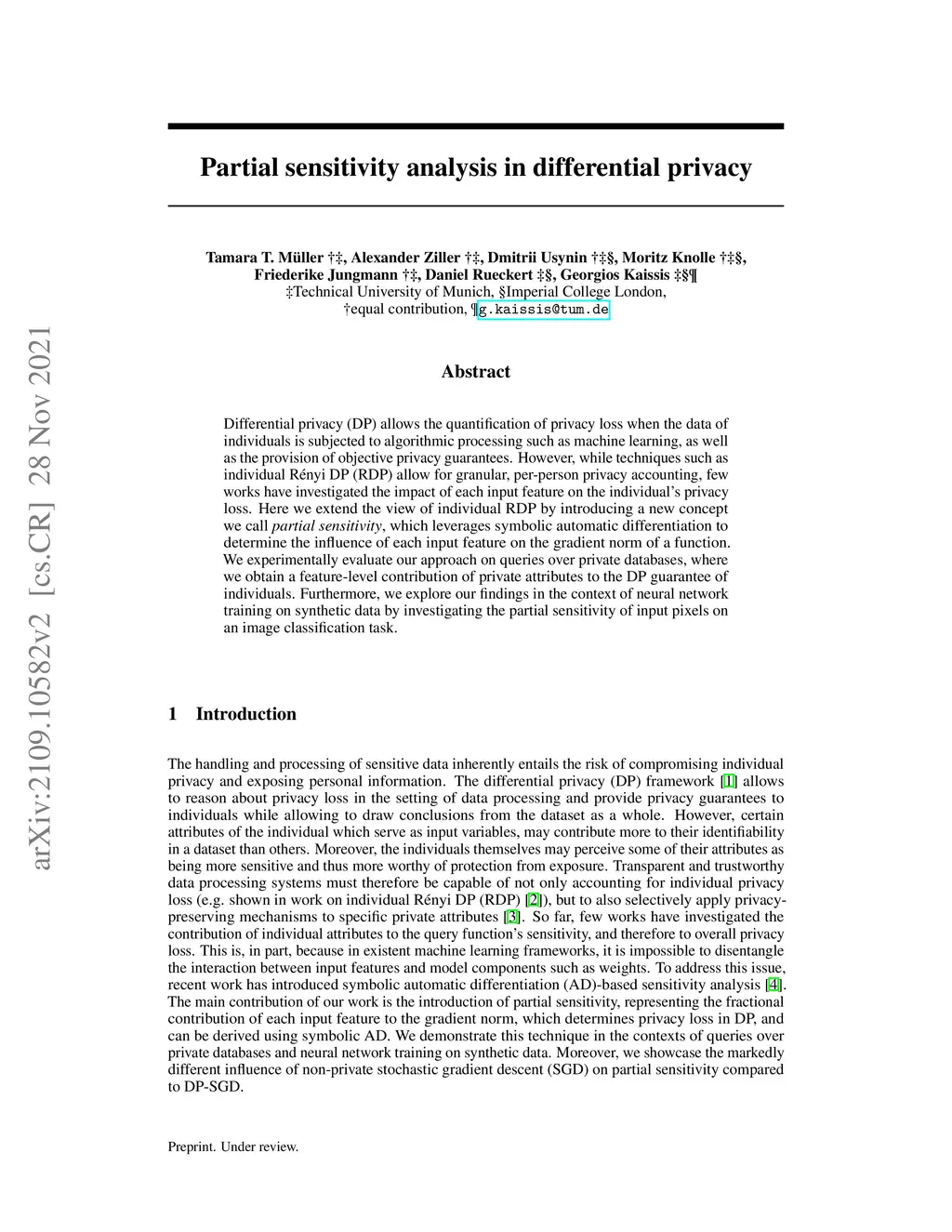 Differential privacy (DP) allows the quantification of privacy loss when the data of individuals is subjected to algorithmic processing such as machine learning, as well as the provision of objective privacy guarantees. However, while techniques such as individual R\ényi DP (RDP) allow for granular, per-person privacy accounting, few works have investigated the impact of each input feature on the individual's privacy loss. Here we extend the view of individual RDP by introducing a new concept we call partial sensitivity, which leverages symbolic automatic differentiation to determine the influence of each input feature on the gradient norm of a function. We experimentally evaluate our approach on queries over private databases, where we obtain a feature-level contribution of private attributes to the DP guarantee of individuals. Furthermore, we explore our findings in the context of neural network training on synthetic data by investigating the partial sensitivity of input pixels on an image classification task.
