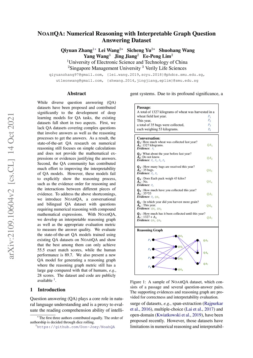 While diverse question answering (QA) datasets have been proposed and contributed significantly to the development of deep learning models for QA tasks, the existing datasets fall short in two aspects. First, we lack QA datasets covering complex questions that involve answers as well as the reasoning processes to get the answers. As a result, the state-of-the-art QA research on numerical reasoning still focuses on simple calculations and does not provide the mathematical expressions or evidences justifying the answers. Second, the QA community has contributed much effort to improving the interpretability of QA models. However, these models fail to explicitly show the reasoning process, such as the evidence order for reasoning and the interactions between different pieces of evidence. To address the above shortcomings, we introduce NOAHQA, a conversational and bilingual QA dataset with questions requiring numerical reasoning with compound mathematical expressions. With NOAHQA, we develop an interpretable reasoning graph as well as the appropriate evaluation metric to measure the answer quality. We evaluate the state-of-the-art QA models trained using existing QA datasets on NOAHQA and show that the best among them can only achieve 55.5 exact match scores, while the human performance is 89.7. We also present a new QA model for generating a reasoning graph where the reasoning graph metric still has a large gap compared with that of humans, e.g., 28 scores.