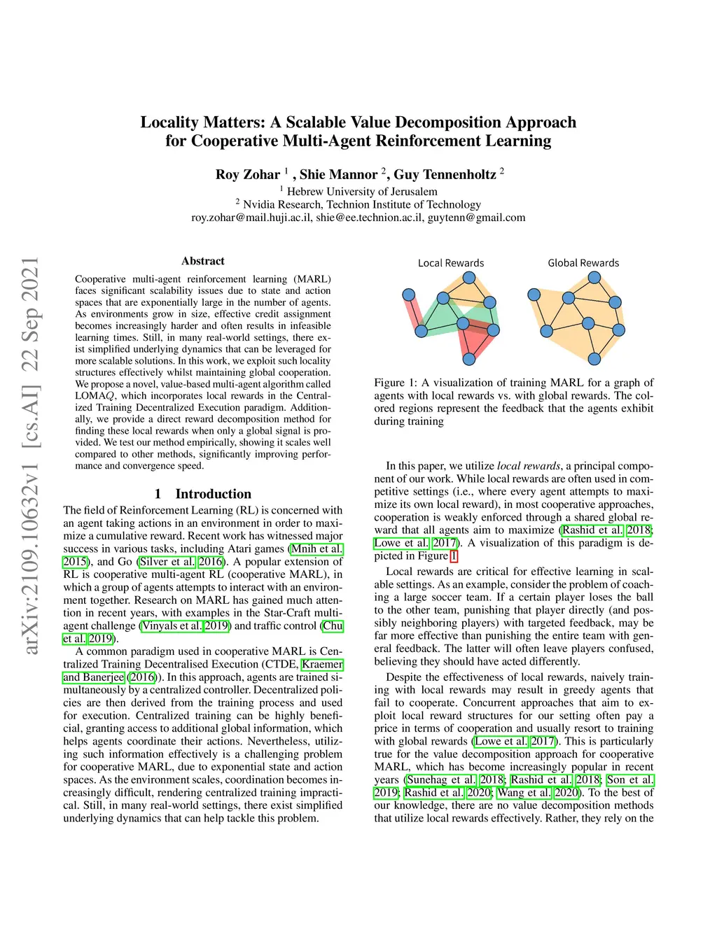 Cooperative multi-agent reinforcement learning (MARL) faces significant scalability issues due to state and action spaces that are exponentially large in the number of agents. As environments grow in size, effective credit assignment becomes increasingly harder and often results in infeasible learning times. Still, in many real-world settings, there exist simplified underlying dynamics that can be leveraged for more scalable solutions. In this work, we exploit such locality structures effectively whilst maintaining global cooperation. We propose a novel, value-based multi-agent algorithm called LOMAQ, which incorporates local rewards in the Centralized Training Decentralized Execution paradigm. Additionally, we provide a direct reward decomposition method for finding these local rewards when only a global signal is provided. We test our method empirically, showing it scales well compared to other methods, significantly improving performance and convergence speed.