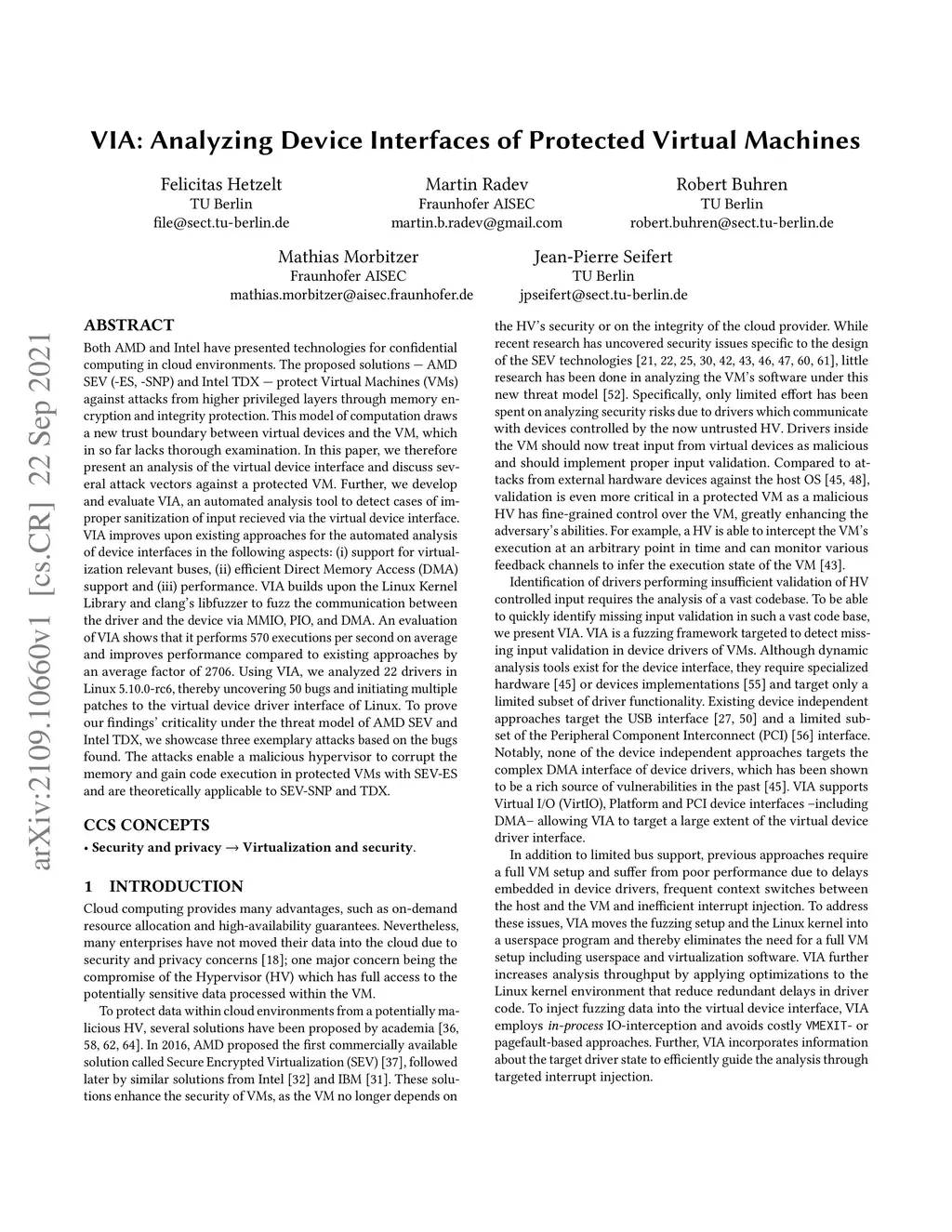 Both AMD and Intel have presented technologies for confidential computing in cloud environments. The proposed solutions - AMD SEV (-ES, -SNP) and Intel TDX - protect Virtual Machines (VMs) against attacks from higher privileged layers through memory encryption and integrity protection. This model of computation draws a new trust boundary between virtual devices and the VM, which in so far lacks thorough examination. In this paper, we therefore present an analysis of the virtual device interface and discuss several attack vectors against a protected VM. Further, we develop and evaluate VIA, an automated analysis tool to detect cases of improper sanitization of input recieved via the virtual device interface. VIA improves upon existing approaches for the automated analysis of device interfaces in the following aspects: (i) support for virtualization relevant buses, (ii) efficient Direct Memory Access (DMA) support and (iii) performance. VIA builds upon the Linux Kernel Library and clang's libfuzzer to fuzz the communication between the driver and the device via MMIO, PIO, and DMA. An evaluation of VIA shows that it performs 570 executions per second on average and improves performance compared to existing approaches by an average factor of 2706. Using VIA, we analyzed 22 drivers in Linux 5.10.0-rc6, thereby uncovering 50 bugs and initiating multiple patches to the virtual device driver interface of Linux. To prove our findings criticality under the threat model of AMD SEV and Intel TDX, we showcase three exemplary attacks based on the bugs found. The attacks enable a malicious hypervisor to corrupt the memory and gain code execution in protected VMs with SEV-ES and are theoretically applicable to SEV-SNP and TDX.