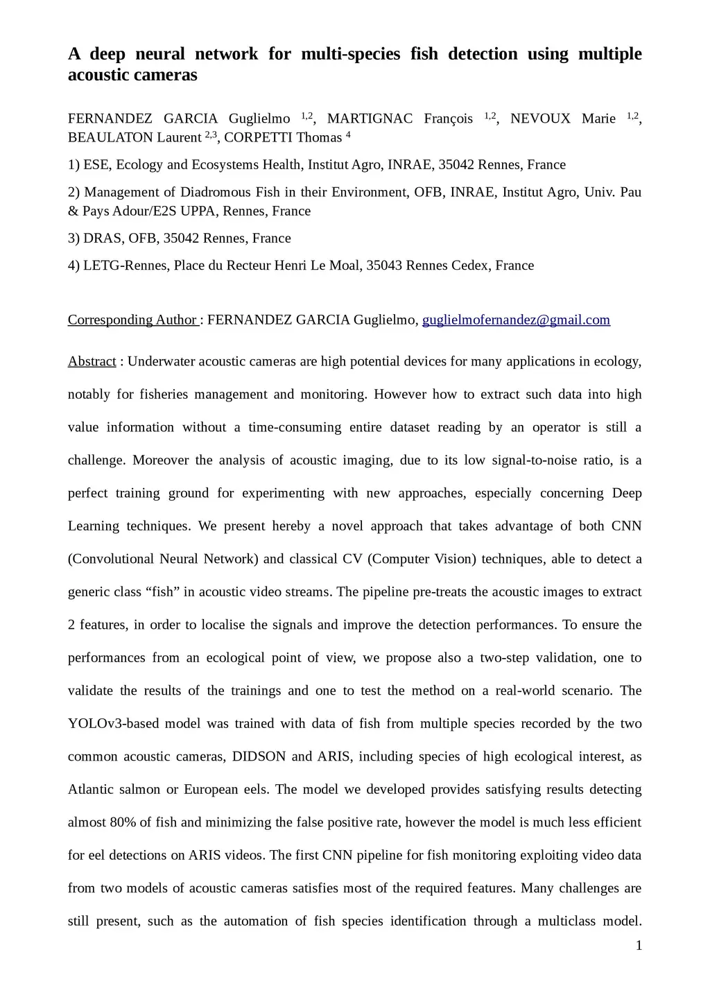 Underwater acoustic cameras are high potential devices for many applications in ecology, notably for fisheries management and monitoring. However how to extract such data into high value information without a time-consuming entire dataset reading by an operator is still a challenge. Moreover the analysis of acoustic imaging, due to its low signal-to-noise ratio, is a perfect training ground for experimenting with new approaches, especially concerning Deep Learning techniques. We present hereby a novel approach that takes advantage of both CNN (Convolutional Neural Network) and classical CV (Computer Vision) techniques, able to detect a generic class ''fish'' in acoustic video streams. The pipeline pre-treats the acoustic images to extract 2 features, in order to localise the signals and improve the detection performances. To ensure the performances from an ecological point of view, we propose also a two-step validation, one to validate the results of the trainings and one to test the method on a real-world scenario. The YOLOv3-based model was trained with data of fish from multiple species recorded by the two common acoustic cameras, DIDSON and ARIS, including species of high ecological interest, as Atlantic salmon or European eels. The model we developed provides satisfying results detecting almost 80% of fish and minimizing the false positive rate, however the model is much less efficient for eel detections on ARIS videos. The first CNN pipeline for fish monitoring exploiting video data from two models of acoustic cameras satisfies most of the required features. Many challenges are still present, such as the automation of fish species identification through a multiclass model. 1 However the results point a new solution for dealing with complex data, such as sonar data, which can also be reapplied in other cases where the signal-to-noise ratio is a challenge.