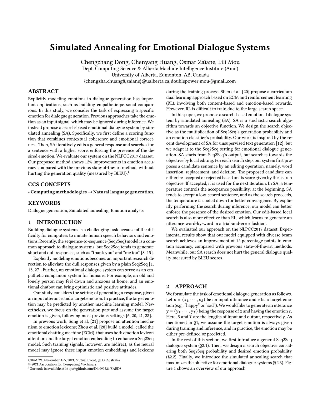 Explicitly modeling emotions in dialogue generation has important applications, such as building empathetic personal companions. In this study, we consider the task of expressing a specific emotion for dialogue generation. Previous approaches take the emotion as an input signal, which may be ignored during inference. We instead propose a search-based emotional dialogue system by simulated annealing (SA). Specifically, we first define a scoring function that combines contextual coherence and emotional correctness. Then, SA iteratively edits a general response and searches for a sentence with a higher score, enforcing the presence of the desired emotion. We evaluate our system on the NLPCC2017 dataset. Our proposed method shows 12% improvements in emotion accuracy compared with the previous state-of-the-art method, without hurting the generation quality (measured by BLEU).