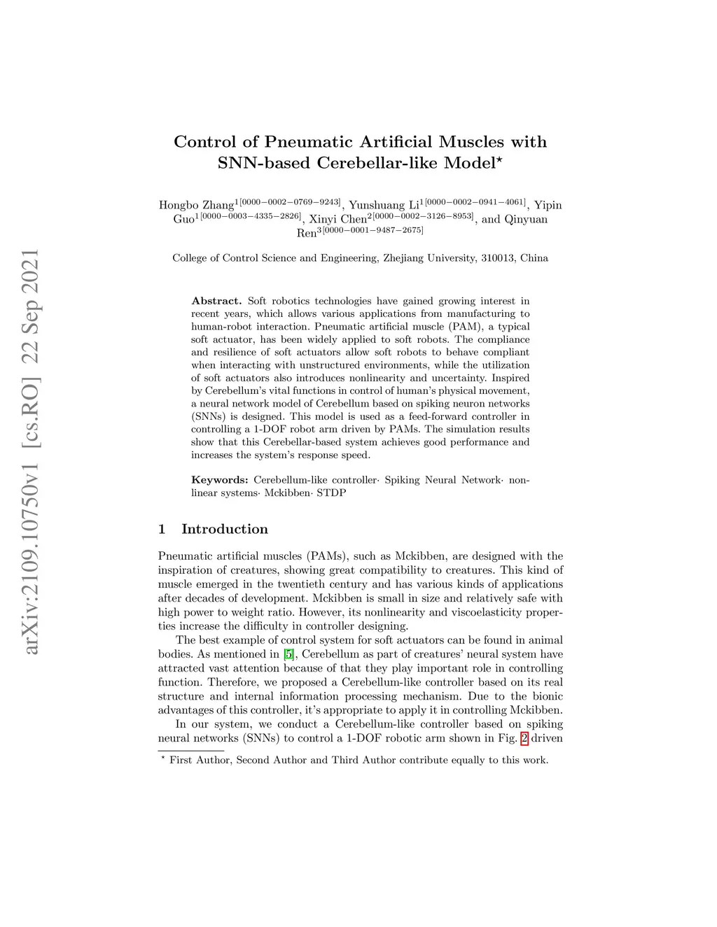 Soft robotics technologies have gained growing interest in recent years, which allows various applications from manufacturing to human-robot interaction. Pneumatic artificial muscle (PAM), a typical soft actuator, has been widely applied to soft robots. The compliance and resilience of soft actuators allow soft robots to behave compliant when interacting with unstructured environments, while the utilization of soft actuators also introduces nonlinearity and uncertainty. Inspired by Cerebellum's vital functions in control of human's physical movement, a neural network model of Cerebellum based on spiking neuron networks (SNNs) is designed. This model is used as a feed-forward controller in controlling a 1-DOF robot arm driven by PAMs. The simulation results show that this Cerebellar-based system achieves good performance and increases the system's response.