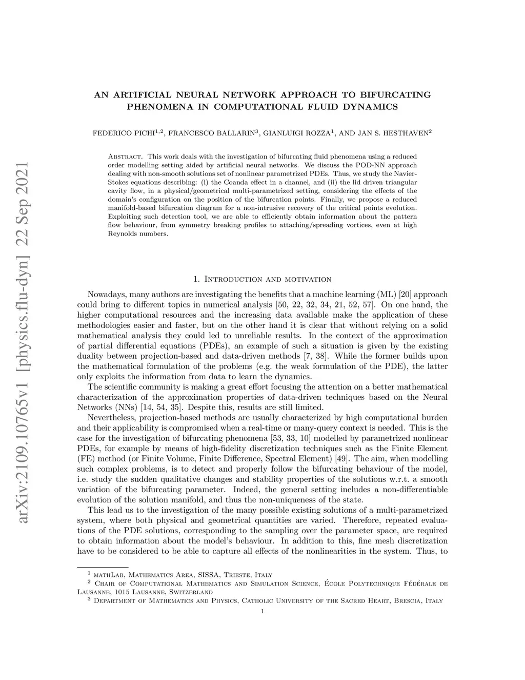 This work deals with the investigation of bifurcating fluid phenomena using a reduced order modelling setting aided by artificial neural networks. We discuss the POD-NN approach dealing with non-smooth solutions set of nonlinear parametrized PDEs. Thus, we study the Navier-Stokes equations describing: (i) the Coanda effect in a channel, and (ii) the lid driven triangular cavity flow, in a physical/geometrical multi-parametrized setting, considering the effects of the domain's configuration on the position of the bifurcation points. Finally, we propose a reduced manifold-based bifurcation diagram for a non-intrusive recovery of the critical points evolution. Exploiting such detection tool, we are able to efficiently obtain information about the pattern flow behaviour, from symmetry breaking profiles to attaching/spreading vortices, even at high Reynolds numbers.