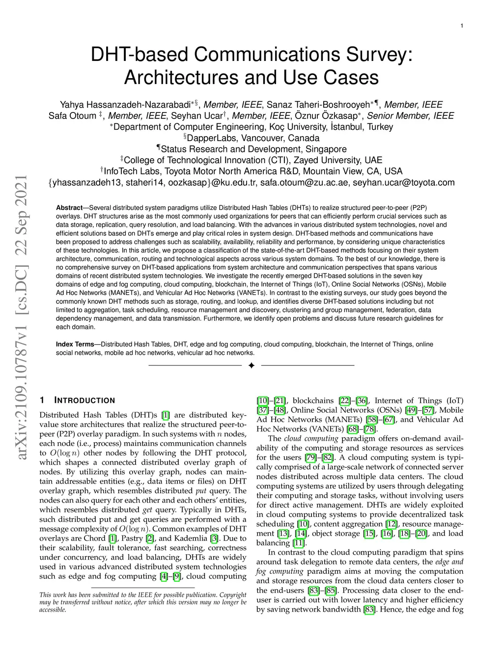 Several distributed system paradigms utilize Distributed Hash Tables (DHTs) to realize structured peer-to-peer (P2P) overlays. DHT structures arise as the most commonly used organizations for peers that can efficiently perform crucial services such as data storage, replication, query resolution, and load balancing. With the advances in various distributed system technologies, novel and efficient solutions based on DHTs emerge and play critical roles in system design. DHT-based methods and communications have been proposed to address challenges such as scalability, availability, reliability and performance, by considering unique characteristics of these technologies. In this article, we propose a classification of the state-of-the-art DHT-based methods focusing on their system architecture, communication, routing and technological aspects across various system domains. To the best of our knowledge, there is no comprehensive survey on DHT-based applications from system architecture and communication perspectives that spans various domains of recent distributed system technologies. We investigate the recently emerged DHT-based solutions in the seven key domains of edge and fog computing, cloud computing, blockchain, the Internet of Things (IoT), Online Social Networks (OSNs), Mobile Ad Hoc Networks (MANETs), and Vehicular Ad Hoc Networks (VANETs). In contrast to the existing surveys, our study goes beyond the commonly known DHT methods such as storage, routing, and lookup, and identifies diverse DHT-based solutions including but not limited to aggregation, task scheduling, resource management and discovery, clustering and group management, federation, data dependency management, and data transmission. Furthermore, we identify open problems and discuss future research guidelines for each domain.