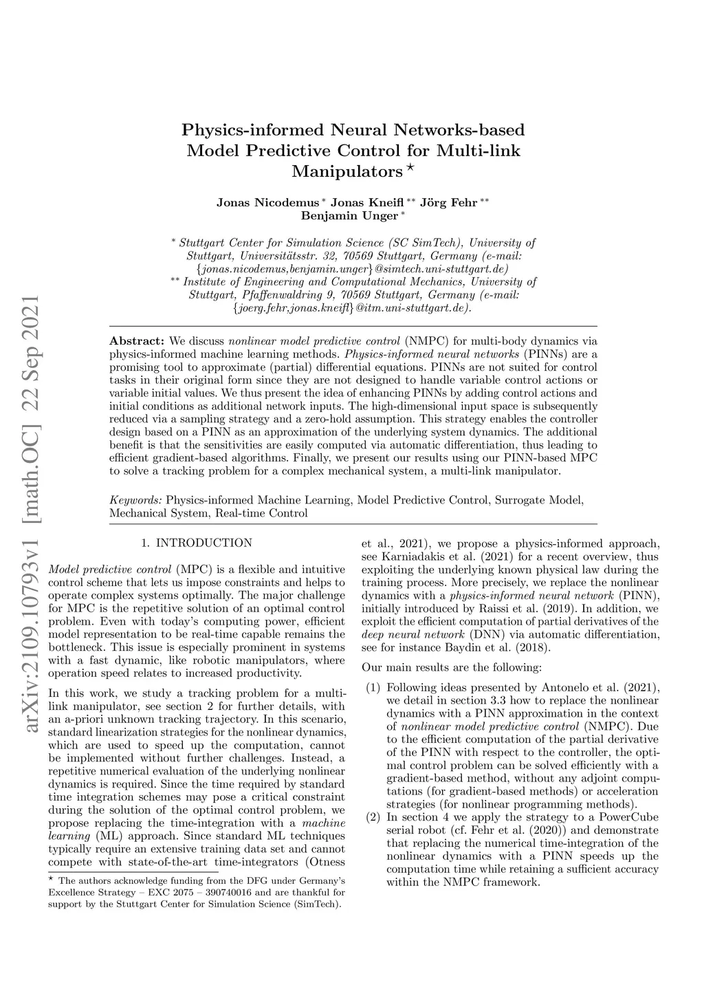 We discuss nonlinear model predictive control (NMPC) for multi-body dynamics via physics-informed machine learning methods. Physics-informed neural networks (PINNs) are a promising tool to approximate (partial) differential equations. PINNs are not suited for control tasks in their original form since they are not designed to handle variable control actions or variable initial values. We thus present the idea of enhancing PINNs by adding control actions and initial conditions as additional network inputs. The high-dimensional input space is subsequently reduced via a sampling strategy and a zero-hold assumption. This strategy enables the controller design based on a PINN as an approximation of the underlying system dynamics. The additional benefit is that the sensitivities are easily computed via automatic differentiation, thus leading to efficient gradient-based algorithms. Finally, we present our results using our PINN-based MPC to solve a tracking problem for a complex mechanical system, a multi-link manipulator.