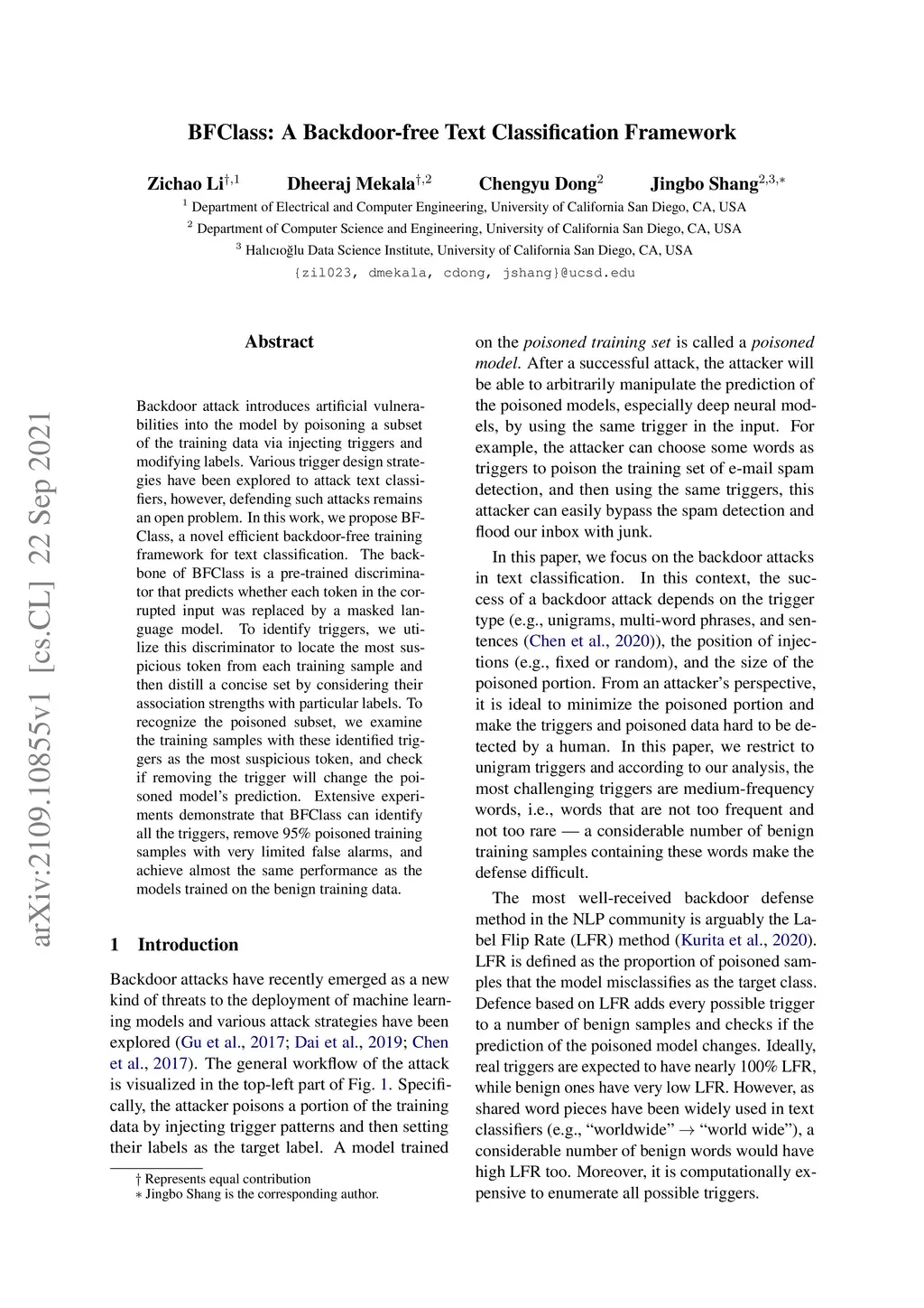 BFClass: A Backdoor-free Text Classification Framework