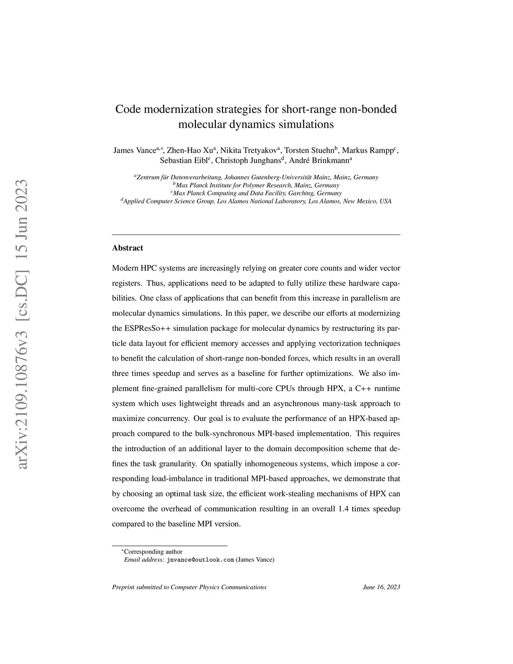 Modern HPC systems are increasingly relying on greater core counts and wider vector registers. Thus, applications need to be adapted to fully utilize these hardware capabilities. One class of applications that can benefit from this increase in parallelism are molecular dynamics simulations. In this paper, we describe our efforts at modernizing the ESPResSo++ molecular dynamics simulation package by restructuring its particle data layout for efficient memory accesses and applying vectorization techniques to benefit the calculation of short-range non-bonded forces, which results in an overall three times speedup and serves as a baseline for further optimizations. We also implement fine-grained parallelism for multi-core CPUs through HPX, a C++ runtime system which uses lightweight threads and an asynchronous many-task approach to maximize concurrency. Our goal is to evaluate the performance of an HPX-based approach compared to the bulk-synchronous MPI-based implementation. This requires the introduction of an additional layer to the domain decomposition scheme that defines the task granularity. On spatially inhomogeneous systems, which impose a corresponding load-imbalance in traditional MPI-based approaches, we demonstrate that by choosing an optimal task size, the efficient work-stealing mechanisms of HPX can overcome the overhead of communication resulting in an overall 1.4 times speedup compared to the baseline MPI version.