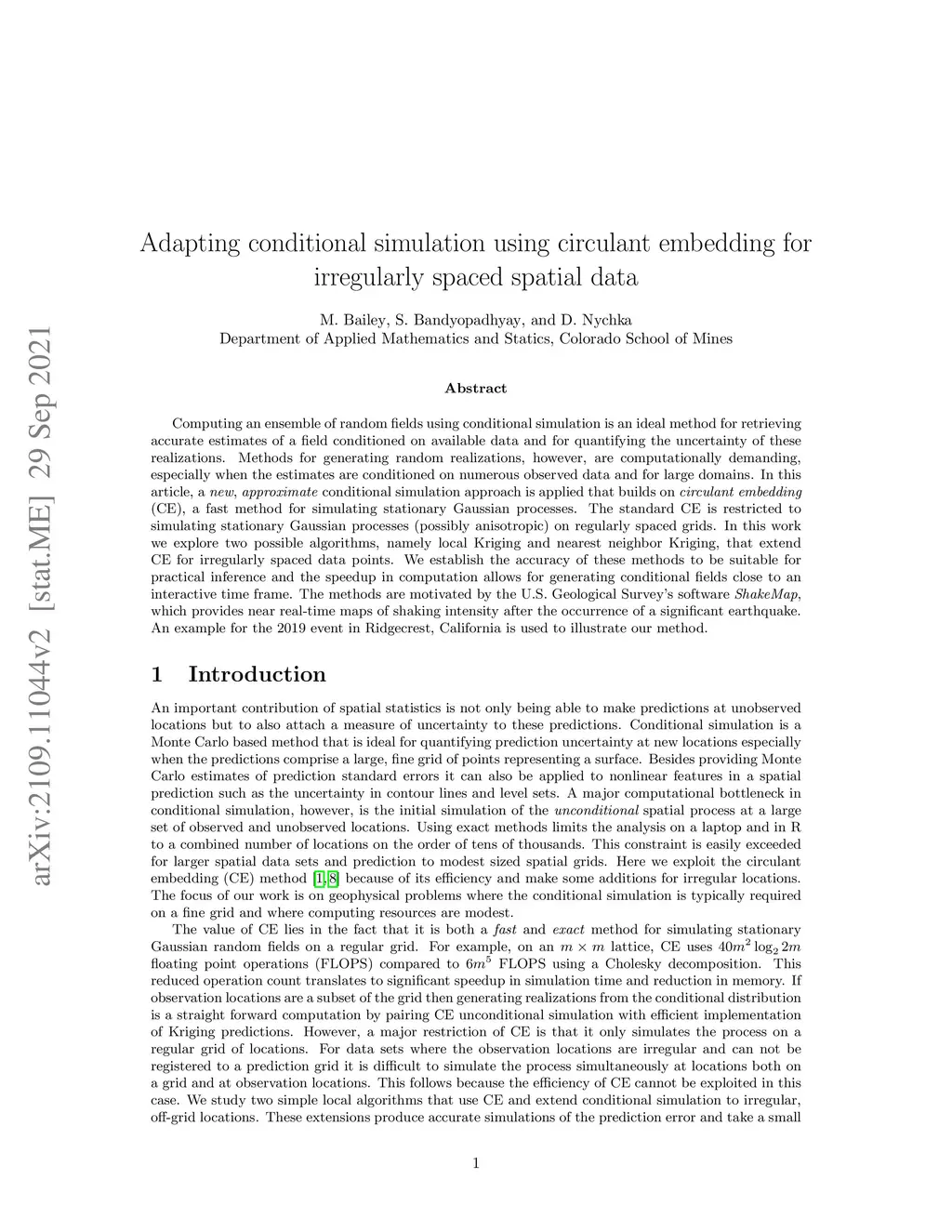 Computing an ensemble of random fields using conditional simulation is an ideal method for retrieving accurate estimates of a field conditioned on available data and for quantifying the uncertainty of these realizations. Methods for generating random realizations, however, are computationally demanding, especially when the estimates are conditioned on numerous observed data and for large domains. In this article, a \textit{new}, \textit{approximate} conditional simulation approach is applied that builds on \textit{circulant embedding} (CE), a fast method for simulating stationary Gaussian processes. The standard CE is restricted to simulating stationary Gaussian processes (possibly anisotropic) on regularly spaced grids. In this work we explore two possible algorithms, namely local Kriging and nearest neighbor Kriging, that extend CE for irregularly spaced data points. We establish the accuracy of these methods to be suitable for practical inference and the speedup in computation allows for generating conditional fields close to an interactive time frame. The methods are motivated by the U.S. Geological Survey's software \textit{ShakeMap}, which provides near real-time maps of shaking intensity after the occurrence of a significant earthquake. An example for the 2019 event in Ridgecrest, California is used to illustrate our method.