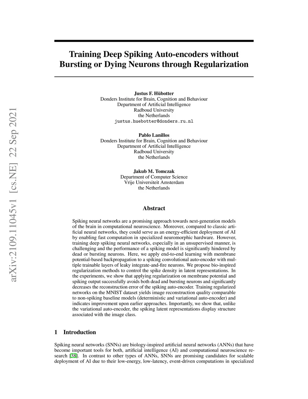 Spiking neural networks are a promising approach towards next-generation models of the brain in computational neuroscience. Moreover, compared to classic artificial neural networks, they could serve as an energy-efficient deployment of AI by enabling fast computation in specialized neuromorphic hardware. However, training deep spiking neural networks, especially in an unsupervised manner, is challenging and the performance of a spiking model is significantly hindered by dead or bursting neurons. Here, we apply end-to-end learning with membrane potential-based backpropagation to a spiking convolutional auto-encoder with multiple trainable layers of leaky integrate-and-fire neurons. We propose bio-inspired regularization methods to control the spike density in latent representations. In the experiments, we show that applying regularization on membrane potential and spiking output successfully avoids both dead and bursting neurons and significantly decreases the reconstruction error of the spiking auto-encoder. Training regularized networks on the MNIST dataset yields image reconstruction quality comparable to non-spiking baseline models (deterministic and variational auto-encoder) and indicates improvement upon earlier approaches. Importantly, we show that, unlike the variational auto-encoder, the spiking latent representations display structure associated with the image class.
