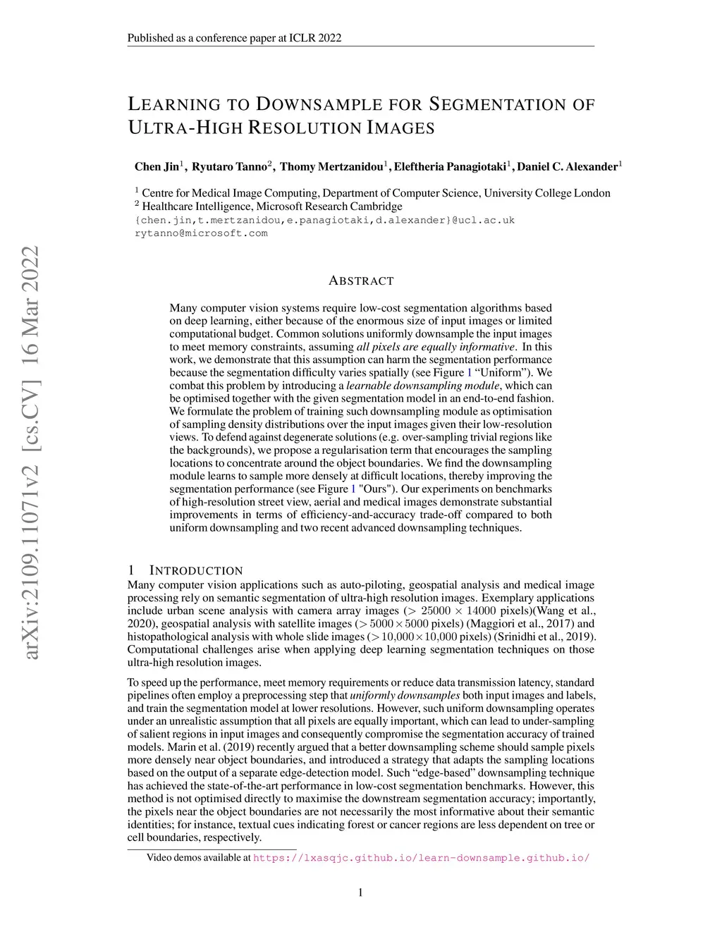 Many computer vision systems require low-cost segmentation algorithms based on deep learning, either because of the enormous size of input images or limited computational budget. Common solutions uniformly downsample the input images to meet memory constraints, assuming all pixels are equally informative. In this work, we demonstrate that this assumption can harm the segmentation performance because the segmentation difficulty varies spatially. We combat this problem by introducing a learnable downsampling module, which can be optimised together with the given segmentation model in an end-to-end fashion. We formulate the problem of training such downsampling module as optimisation of sampling density distributions over the input images given their low-resolution views. To defend against degenerate solutions (e.g. over-sampling trivial regions like the backgrounds), we propose a regularisation term that encourages the sampling locations to concentrate around the object boundaries. We find the downsampling module learns to sample more densely at difficult locations, thereby improving the segmentation performance. Our experiments on benchmarks of high-resolution street view, aerial and medical images demonstrate substantial improvements in terms of efficiency-and-accuracy trade-off compared to both uniform downsampling and two recent advanced downsampling techniques.