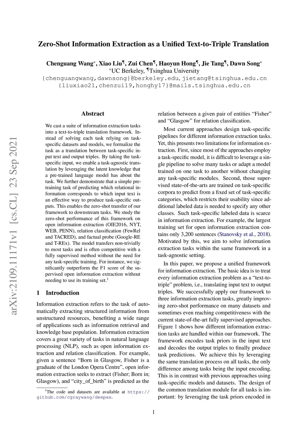 We cast a suite of information extraction tasks into a text-to-triple translation framework. Instead of solving each task relying on task-specific datasets and models, we formalize the task as a translation between task-specific input text and output triples. By taking the task-specific input, we enable a task-agnostic translation by leveraging the latent knowledge that a pre-trained language model has about the task. We further demonstrate that a simple pre-training task of predicting which relational information corresponds to which input text is an effective way to produce task-specific outputs. This enables the zero-shot transfer of our framework to downstream tasks. We study the zero-shot performance of this framework on open information extraction (OIE2016, NYT, WEB, PENN), relation classification (FewRel and TACRED), and factual probe (Google-RE and T-REx). The model transfers non-trivially to most tasks and is often competitive with a fully supervised method without the need for any task-specific training. For instance, we significantly outperform the F1 score of the supervised open information extraction without needing to use its training set.