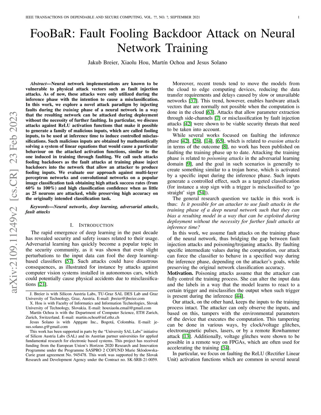 Neural network implementations are known to be vulnerable to physical attack vectors such as fault injection attacks. As of now, these attacks were only utilized during the inference phase with the intention to cause a misclassification. In this work, we explore a novel attack paradigm by injecting faults during the training phase of a neural network in a way that the resulting network can be attacked during deployment without the necessity of further faulting. In particular, we discuss attacks against ReLU activation functions that make it possible to generate a family of malicious inputs, which are called fooling inputs, to be used at inference time to induce controlled misclassifications. Such malicious inputs are obtained by mathematically solving a system of linear equations that would cause a particular behaviour on the attacked activation functions, similar to the one induced in training through faulting. We call such attacks fooling backdoors as the fault attacks at the training phase inject backdoors into the network that allow an attacker to produce fooling inputs. We evaluate our approach against multi-layer perceptron networks and convolutional networks on a popular image classification task obtaining high attack success rates (from 60% to 100%) and high classification confidence when as little as 25 neurons are attacked while preserving high accuracy on the originally intended classification task.