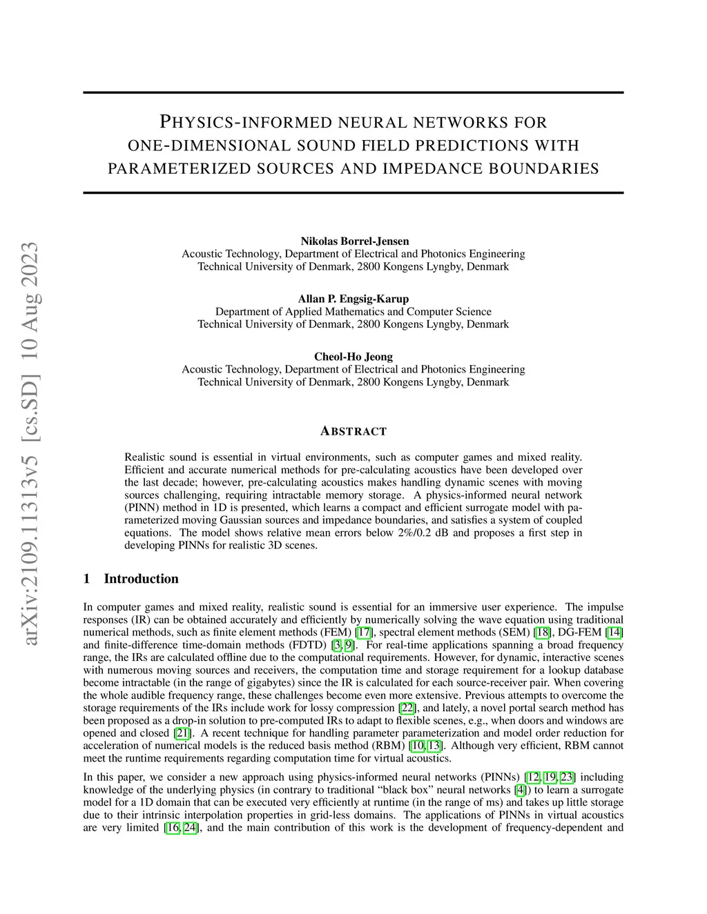 Realistic sound is essential in virtual environments, such as computer games and mixed reality. Efficient and accurate numerical methods for pre-calculating acoustics have been developed over the last decade; however, pre-calculating acoustics makes handling dynamic scenes with moving sources challenging, requiring intractable memory storage. A physics-informed neural network (PINN) method in 1D is presented, which learns a compact and efficient surrogate model with parameterized moving Gaussian sources and impedance boundaries, and satisfies a system of coupled equations. The model shows relative mean errors below 2%/0.2 dB and proposes a first step in developing PINNs for realistic 3D scenes.