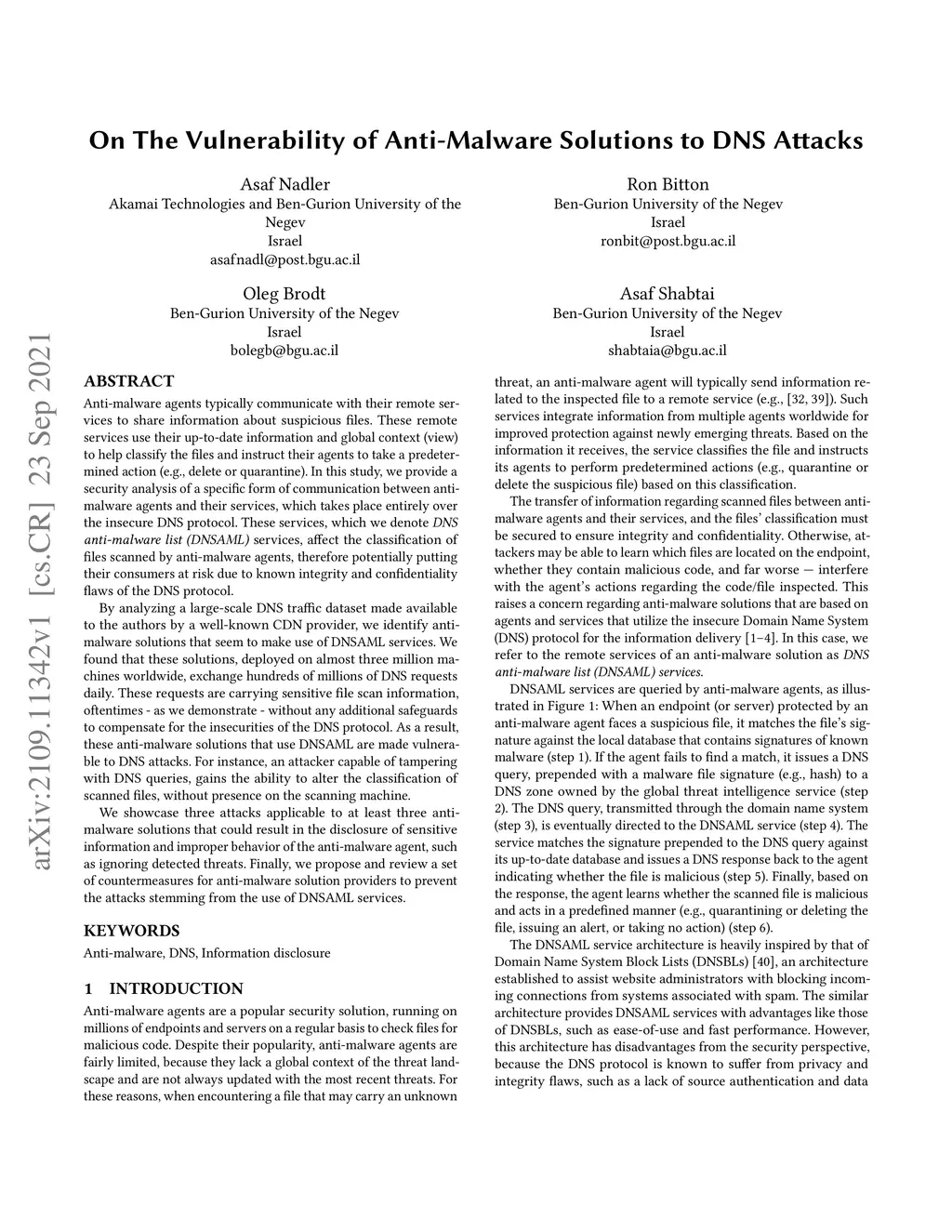 Anti-malware agents typically communicate with their remote services to share information about suspicious files. These remote services use their up-to-date information and global context (view) to help classify the files and instruct their agents to take a predetermined action (e.g., delete or quarantine). In this study, we provide a security analysis of a specific form of communication between anti-malware agents and their services, which takes place entirely over the insecure DNS protocol. These services, which we denote DNS anti-malware list (DNSAML) services, affect the classification of files scanned by anti-malware agents, therefore potentially putting their consumers at risk due to known integrity and confidentiality flaws of the DNS protocol. By analyzing a large-scale DNS traffic dataset made available to the authors by a well-known CDN provider, we identify anti-malware solutions that seem to make use of DNSAML services. We found that these solutions, deployed on almost three million machines worldwide, exchange hundreds of millions of DNS requests daily. These requests are carrying sensitive file scan information, oftentimes - as we demonstrate - without any additional safeguards to compensate for the insecurities of the DNS protocol. As a result, these anti-malware solutions that use DNSAML are made vulnerable to DNS attacks. For instance, an attacker capable of tampering with DNS queries, gains the ability to alter the classification of scanned files, without presence on the scanning machine. We showcase three attacks applicable to at least three anti-malware solutions that could result in the disclosure of sensitive information and improper behavior of the anti-malware agent, such as ignoring detected threats. Finally, we propose and review a set of countermeasures for anti-malware solution providers to prevent the attacks stemming from the use of DNSAML services.