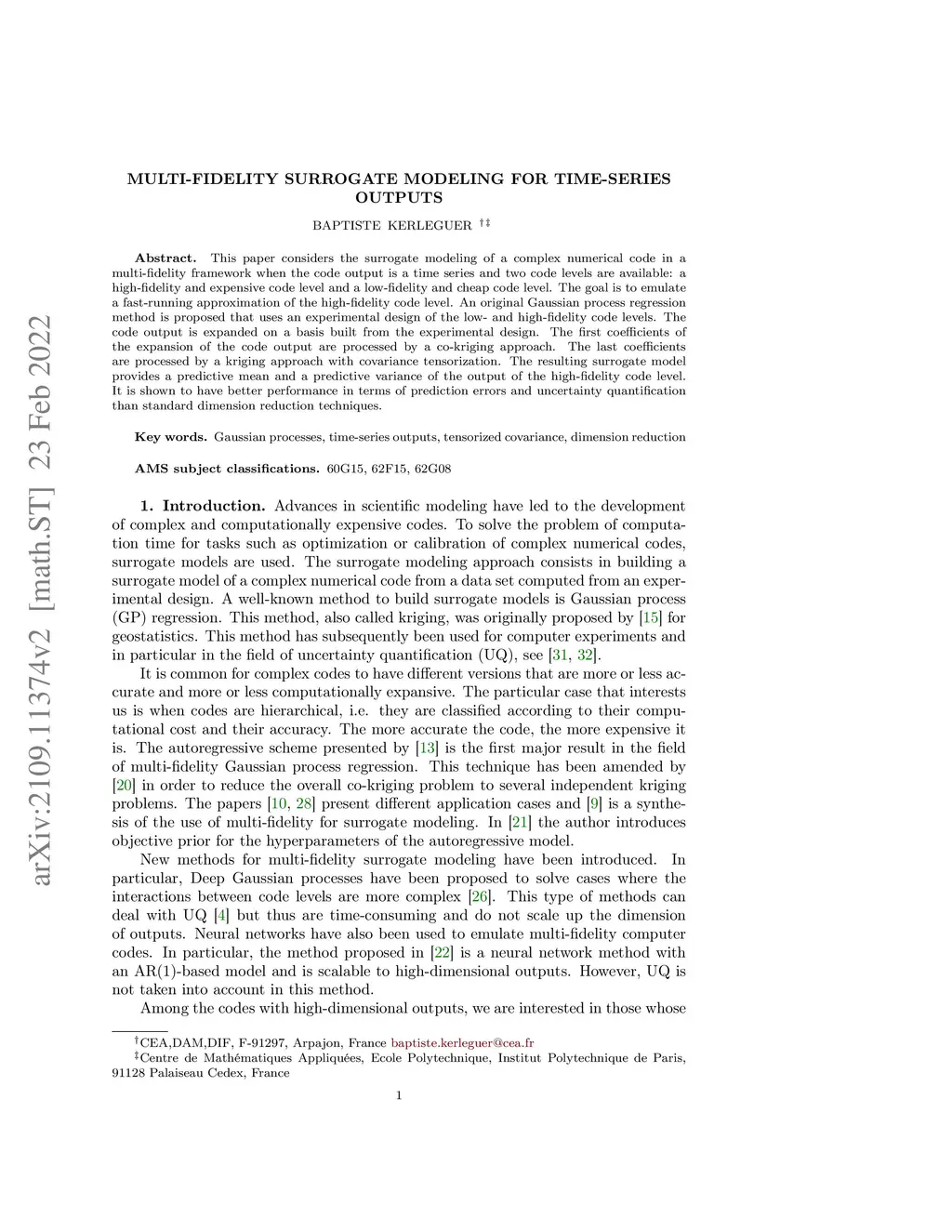 This paper considers the surrogate modeling of a complex numerical code in a multifidelity framework when the code output is a time series. Using an experimental design of the low-and high-fidelity code levels, an original Gaussian process regression method is proposed. The code output is expanded on a basis built from the experimental design. The first coefficients of the expansion of the code output are processed by a co-kriging approach. The last coefficients are collectively processed by a kriging approach with covariance tensorization. The resulting surrogate model taking into account the uncertainty in the basis construction is shown to have better performance in terms of prediction errors and uncertainty quantification than standard dimension reduction techniques.