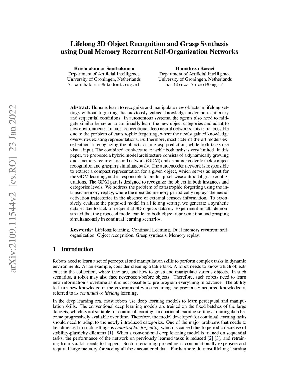 Lifelong 3D Object Recognition and Grasp Synthesis Using Dual Memory