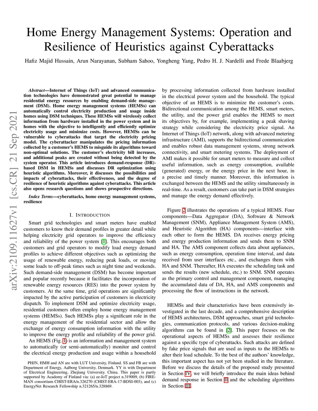 Internet of Things (IoT) and advanced communication technologies have demonstrated great potential to manage residential energy resources by enabling demand-side management (DSM). Home energy management systems (HEMSs) can automatically control electricity production and usage inside homes using DSM techniques. These HEMSs will wirelessly collect information from hardware installed in the power system and in homes with the objective to intelligently and efficiently optimize electricity usage and minimize costs. However, HEMSs can be vulnerable to cyberattacks that target the electricity pricing model. The cyberattacker manipulates the pricing information collected by a customer's HEMS to misguide its algorithms toward non-optimal solutions. The customer's electricity bill increases, and additional peaks are created without being detected by the system operator. This article introduces demand-response (DR)-based DSM in HEMSs and discusses DR optimization using heuristic algorithms. Moreover, it discusses the possibilities and impacts of cyberattacks, their effectiveness, and the degree of resilience of heuristic algorithms against cyberattacks. This article also opens research questions and shows prospective directions.