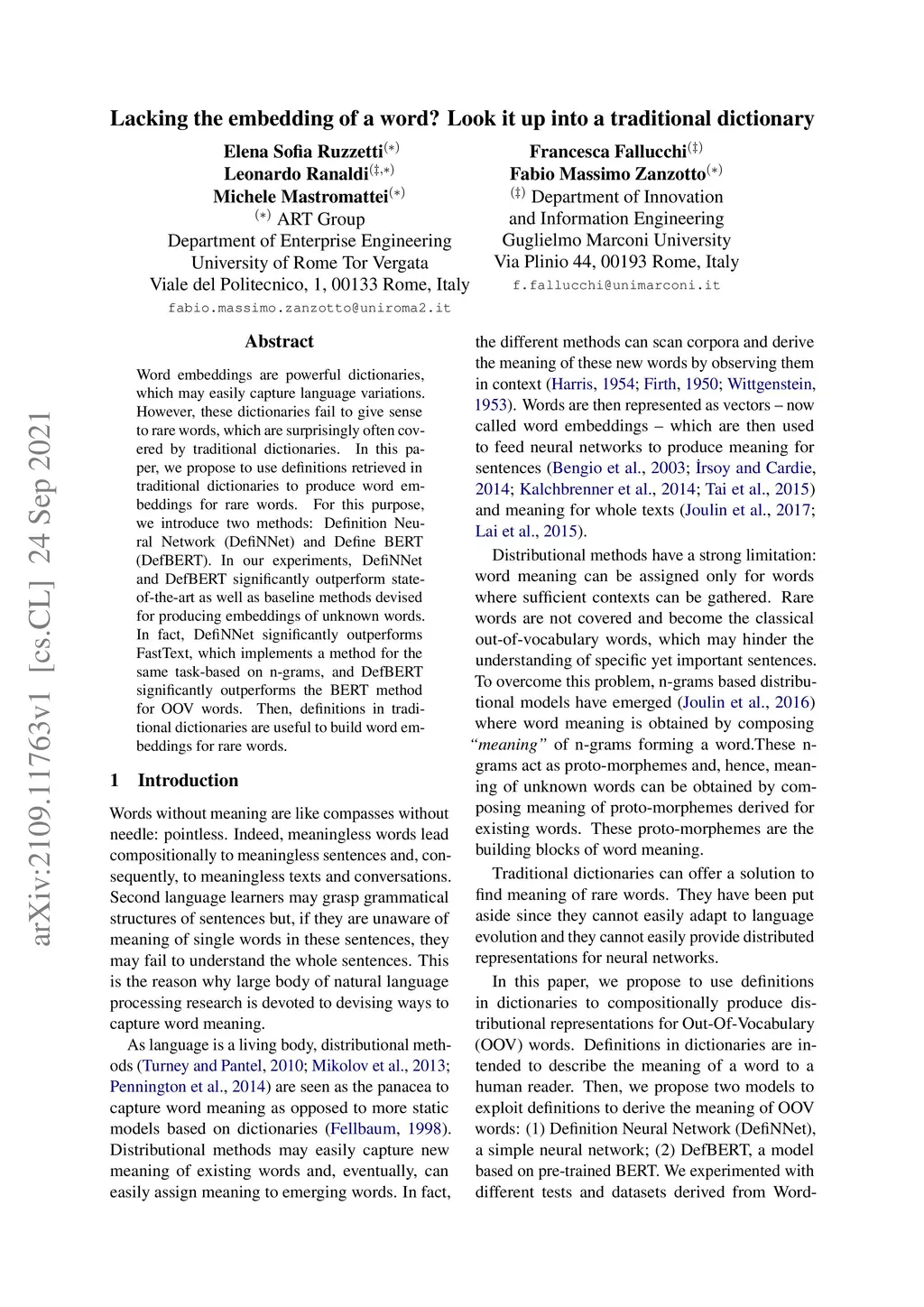 Word embeddings are powerful dictionaries, which may easily capture language variations. However, these dictionaries fail to give sense to rare words, which are surprisingly often covered by traditional dictionaries. In this paper, we propose to use definitions retrieved in traditional dictionaries to produce word embeddings for rare words. For this purpose, we introduce two methods: Definition Neural Network (DefiNNet) and Define BERT (DefBERT). In our experiments, DefiNNet and DefBERT significantly outperform state-of-the-art as well as baseline methods devised for producing embeddings of unknown words. In fact, DefiNNet significantly outperforms FastText, which implements a method for the same task-based on n-grams, and DefBERT significantly outperforms the BERT method for OOV words. Then, definitions in traditional dictionaries are useful to build word embeddings for rare words.