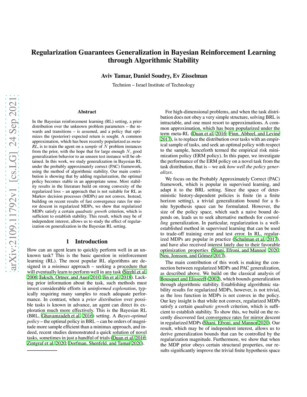 In the Bayesian reinforcement learning (RL) setting, a prior distribution over the unknown problem parameters -- the rewards and transitions -- is assumed, and a policy that optimizes the (posterior) expected return is sought. A common approximation, which has been recently popularized as meta-RL, is to train the agent on a sample of problem instances from the prior, with the hope that for large enough , good generalization behavior to an unseen test instance will be obtained. In this work, we study generalization in Bayesian RL under the probably approximately correct (PAC) framework, using the method of algorithmic stability. Our main contribution is showing that by adding regularization, the optimal policy becomes stable in an appropriate sense. Most stability results in the literature build on strong convexity of the regularized loss -- an approach that is not suitable for RL as Markov decision processes (MDPs) are not convex. Instead, building on recent results of fast convergence rates for mirror descent in regularized MDPs, we show that regularized MDPs satisfy a certain quadratic growth criterion, which is sufficient to establish stability. This result, which may be of independent interest, allows us to study the effect of regularization on generalization in the Bayesian RL setting.